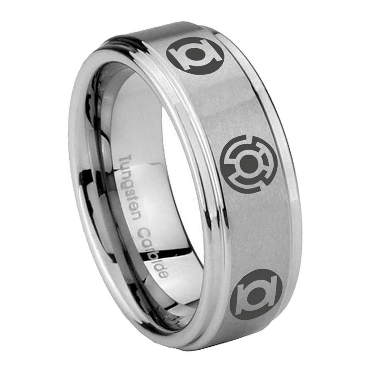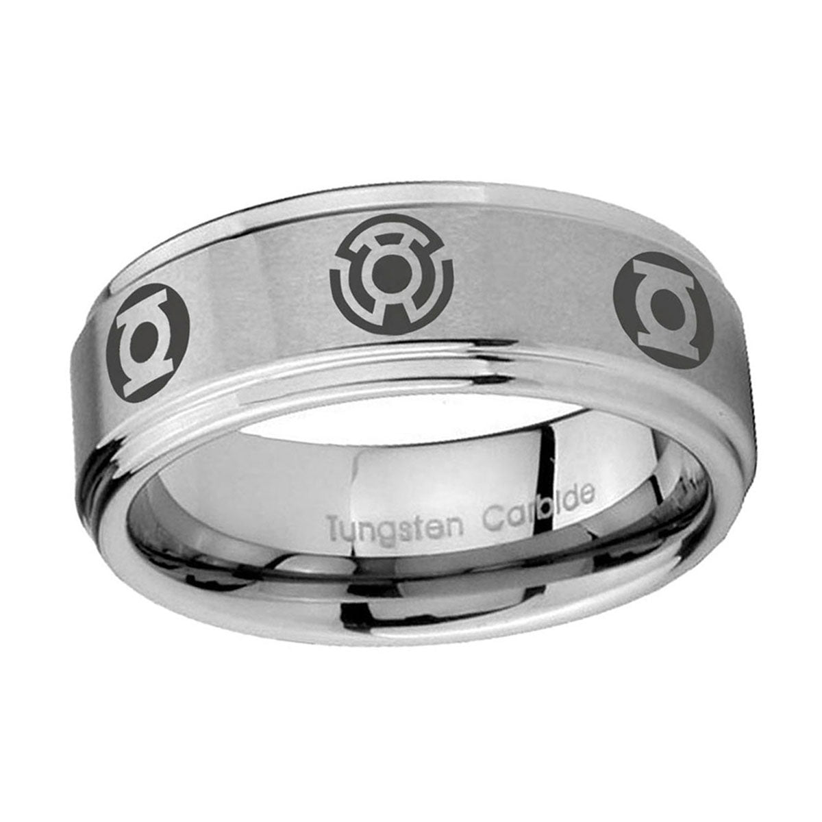 Introuding 5, 8mm Blue Green Lantern Step Edge Brushed Silver Mens Steel Wedding Bands . Offer in both 5mm and 8mm band width brushed grey finished from size 4 to 14