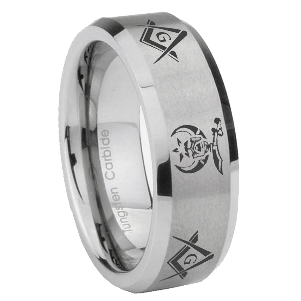 Introducing 6, 8mm Masonic Shriners Beveled Edge Brushed Grey Tungsten Mens Anniversary Ring . Offer in both 6mm and 8mm band width brushed grey finished from size 5 to 14
