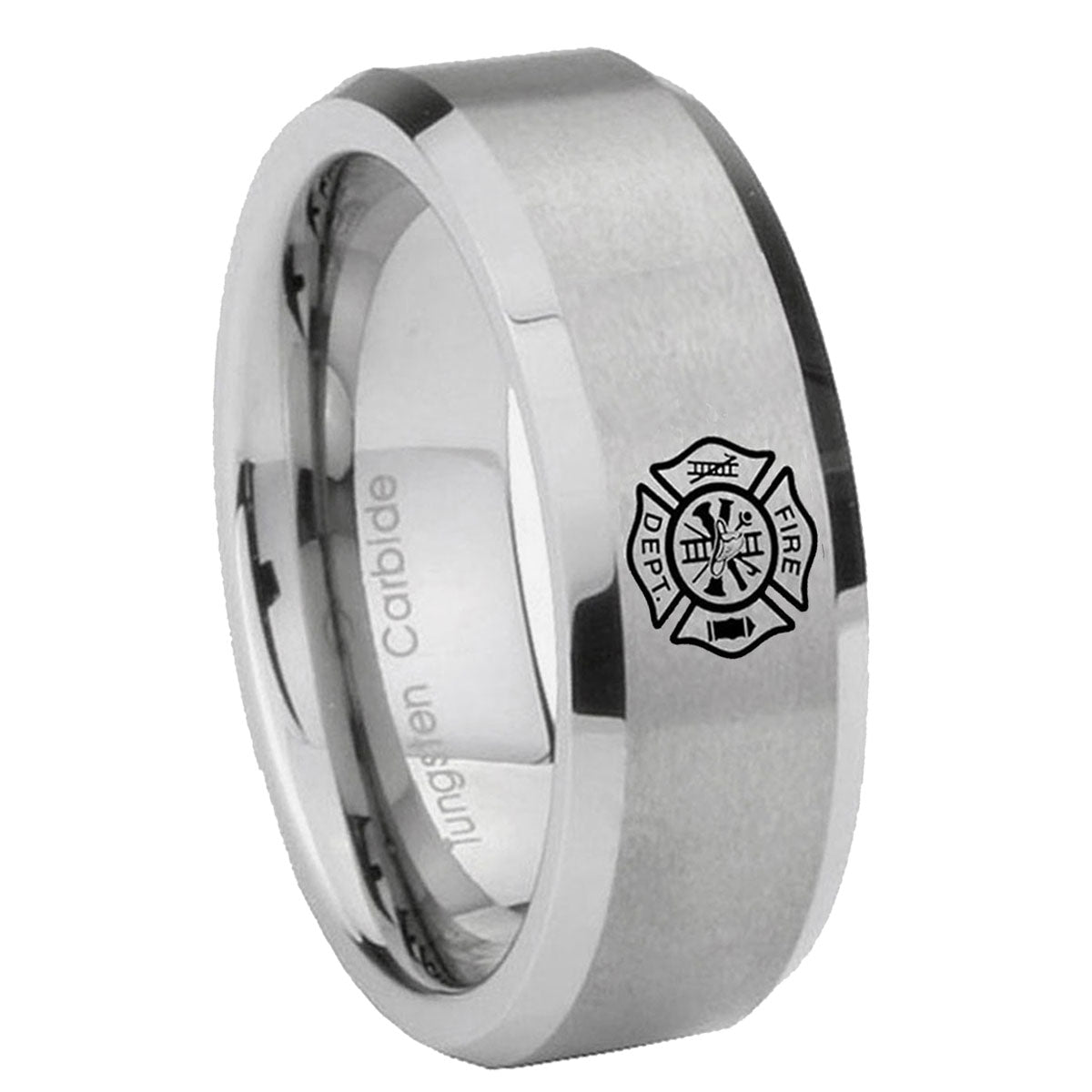 Introducing 6, 8mm Fire Department Beveled Edge Brushed Grey Tungsten Men's Promise Rings . Offer in both 6mm and 8mm band width brushed grey finished from size 5 to 14