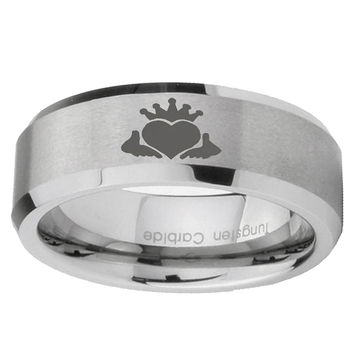 Introducing 6, 8mm Claddagh Design Beveled Edge Brushed Grey Tungsten Rings for Men . Offer in both 6mm and 8mm band width brushed grey finished from size 5 to 14