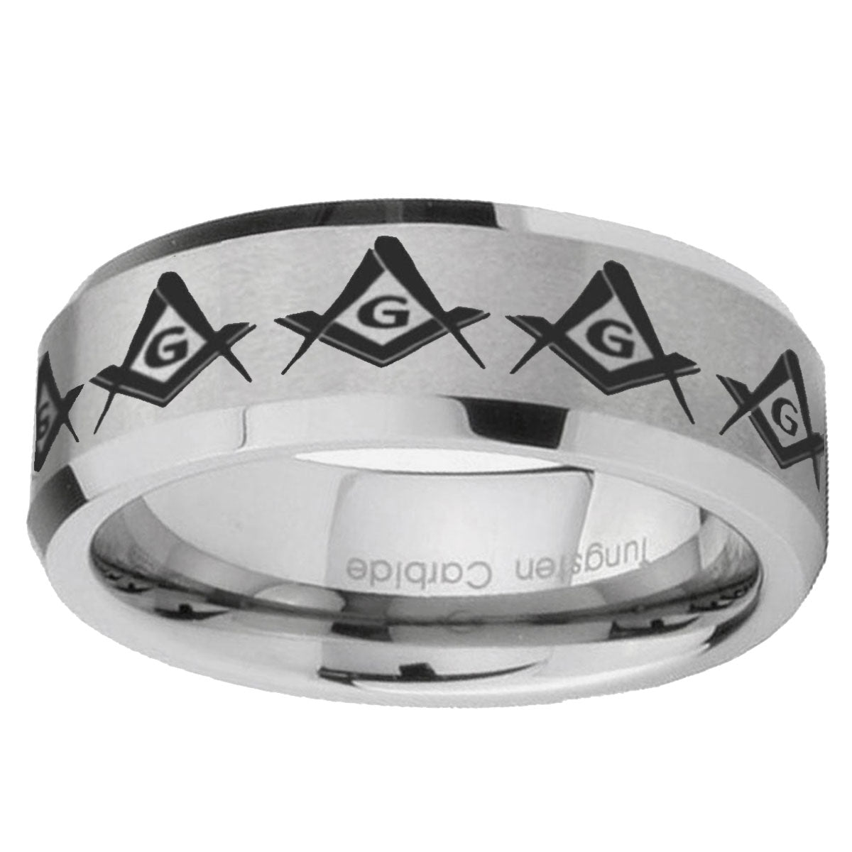 Introducing 6, 8mm Masonic Square and Compass Beveled Edge Brushed Grey Tungsten Wedding Engagement Ring . Offer in both 6mm and 8mm band width brushed grey finished from size 5 to 14