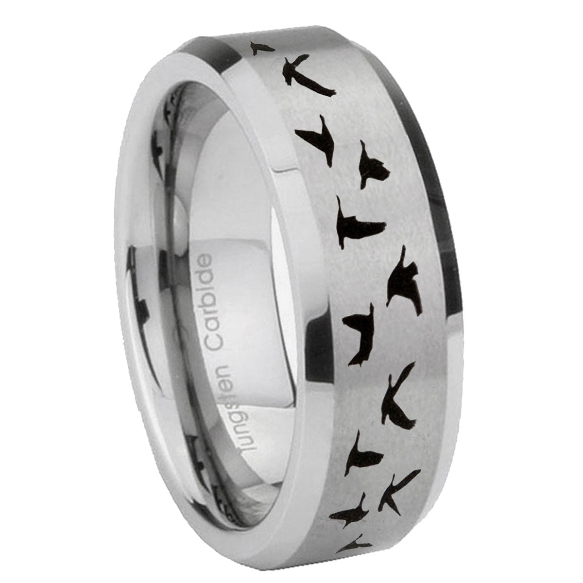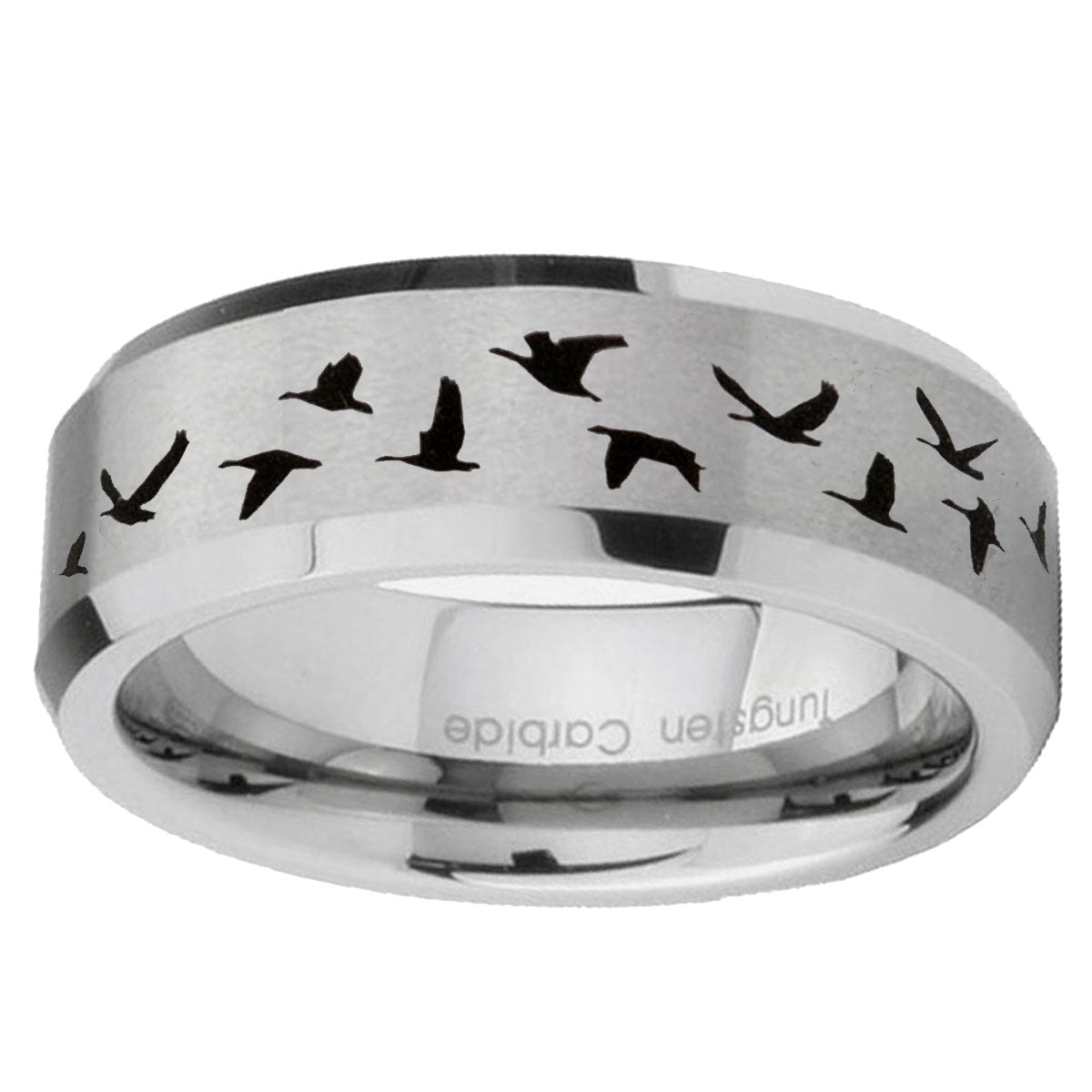 6, 8mm Flying Geese Hunting Beveled Edge Brushed Grey Tungsten Mens Ring