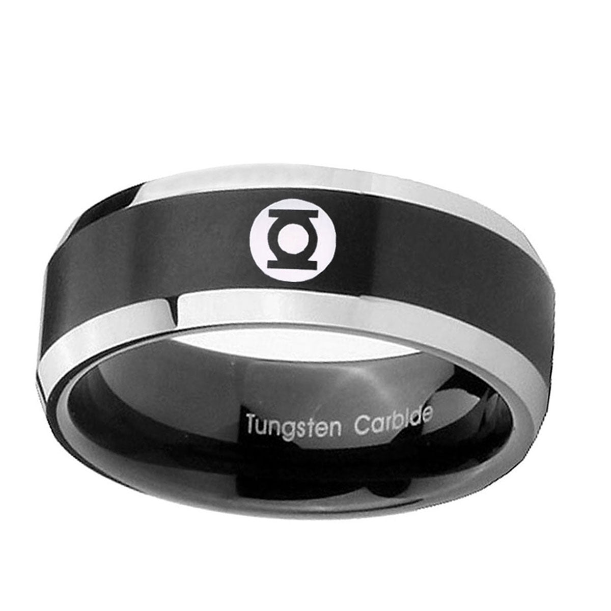 Introuding 5, 8mm Green Lantern Beveled Edge Two Tone Black Tungsten Mens Wedding Rings . Offer in both 5mm and 8mm band width black two tone finished from size 4 to 14