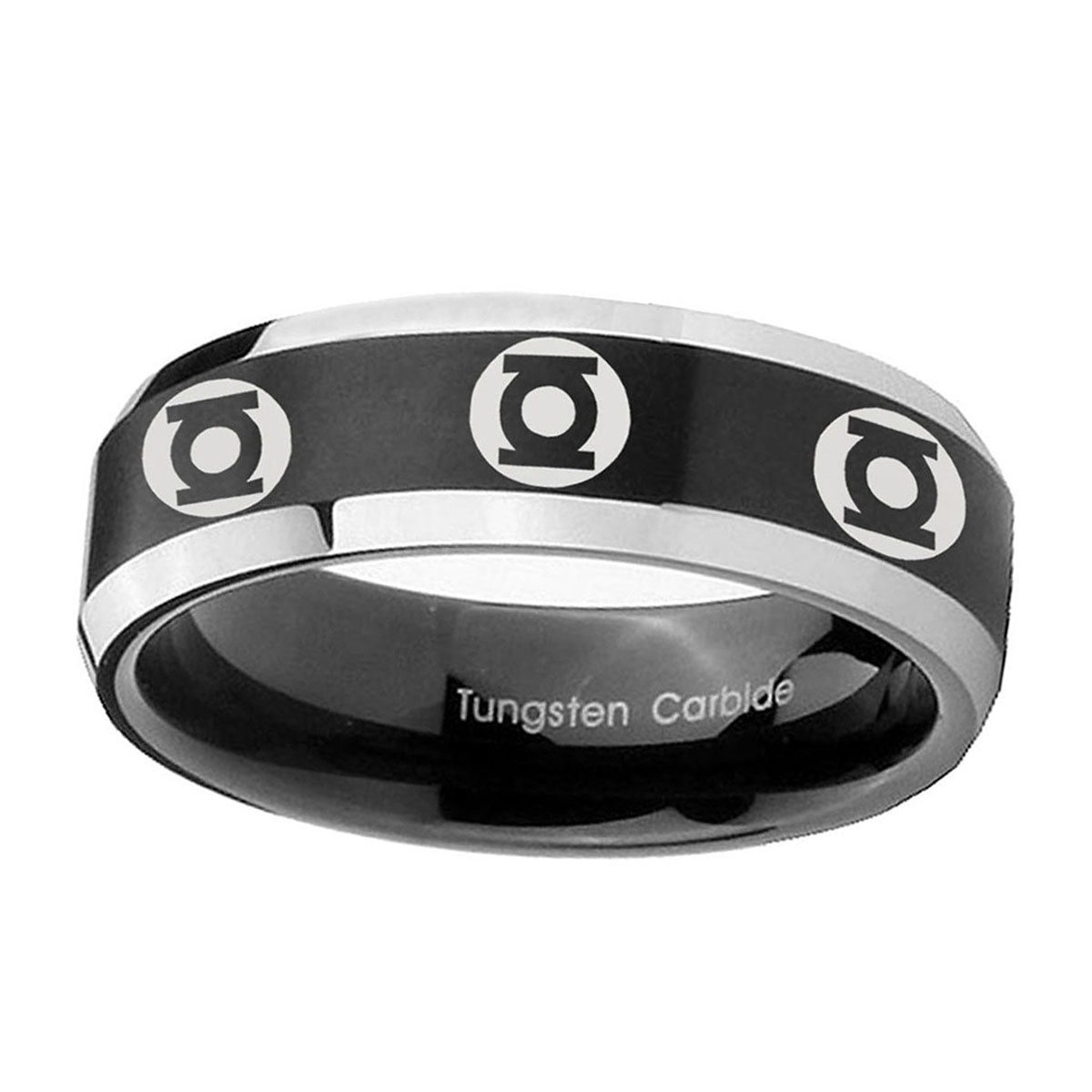 Introuding 5, 8mm Multiple Green Lantern Beveled Edge Two Tone Black Tungsten Men Wedding Bands . Offer in both 5mm and 8mm band width black two tone finished from size 4 to 14