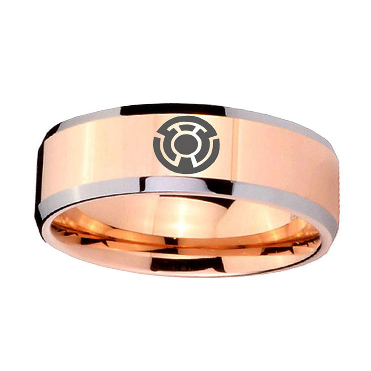 Introuding 5, 8mm Yellow Lantern Beveled Edge Rose Gold Personalized Tungsten Rings . Offer in both 5mm and 8mm band width rose gold two tone finished from size 4 to 14