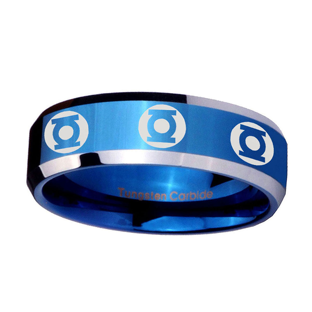 Introuding 5, 8mm Multiple Green Lantern Beveled Edge Blue Mens Wedding Rings Tungsten . Offer in both 5mm and 8mm band width blue plated 2 tone finished from size 4 to 14