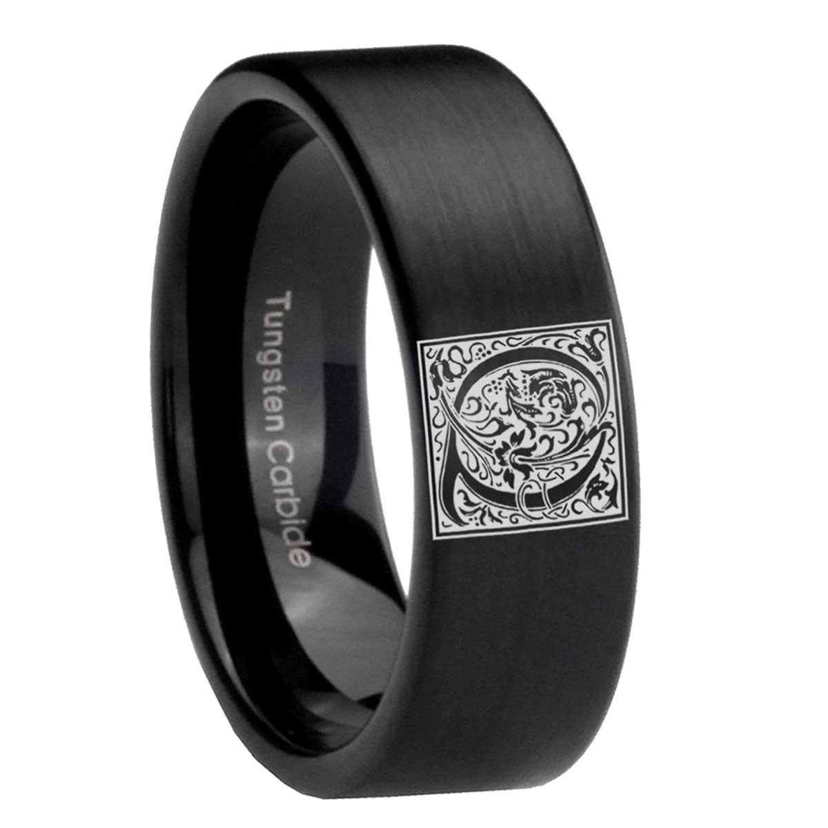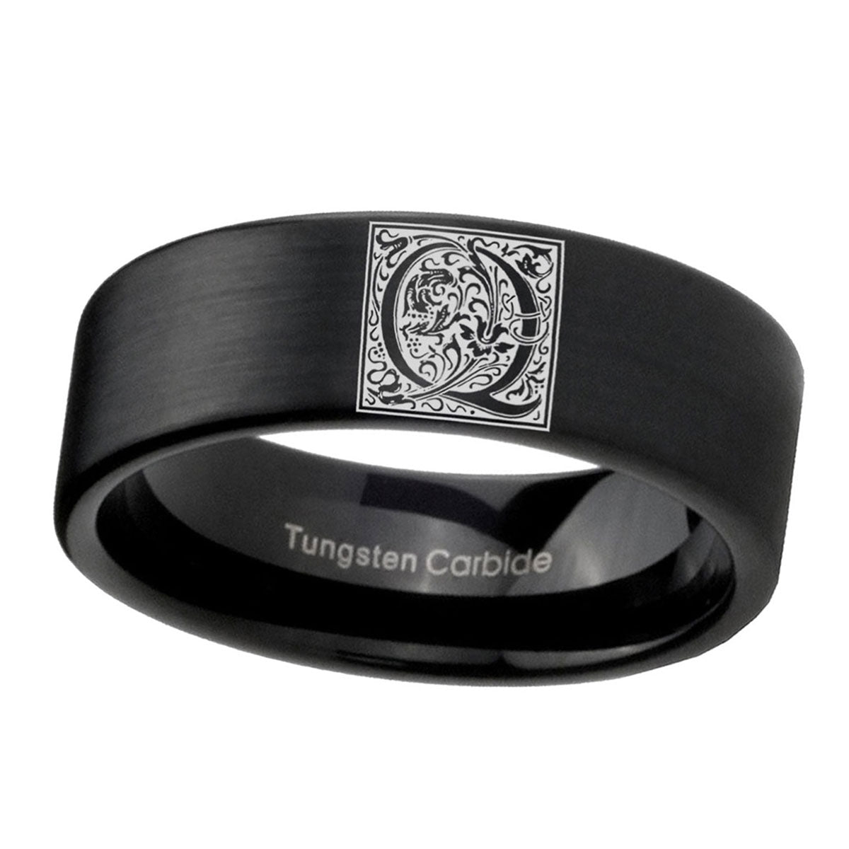 8mm Pipe Cut Matte Black Tungsten Floral Initial Letter Q, Monogram Wedding Band