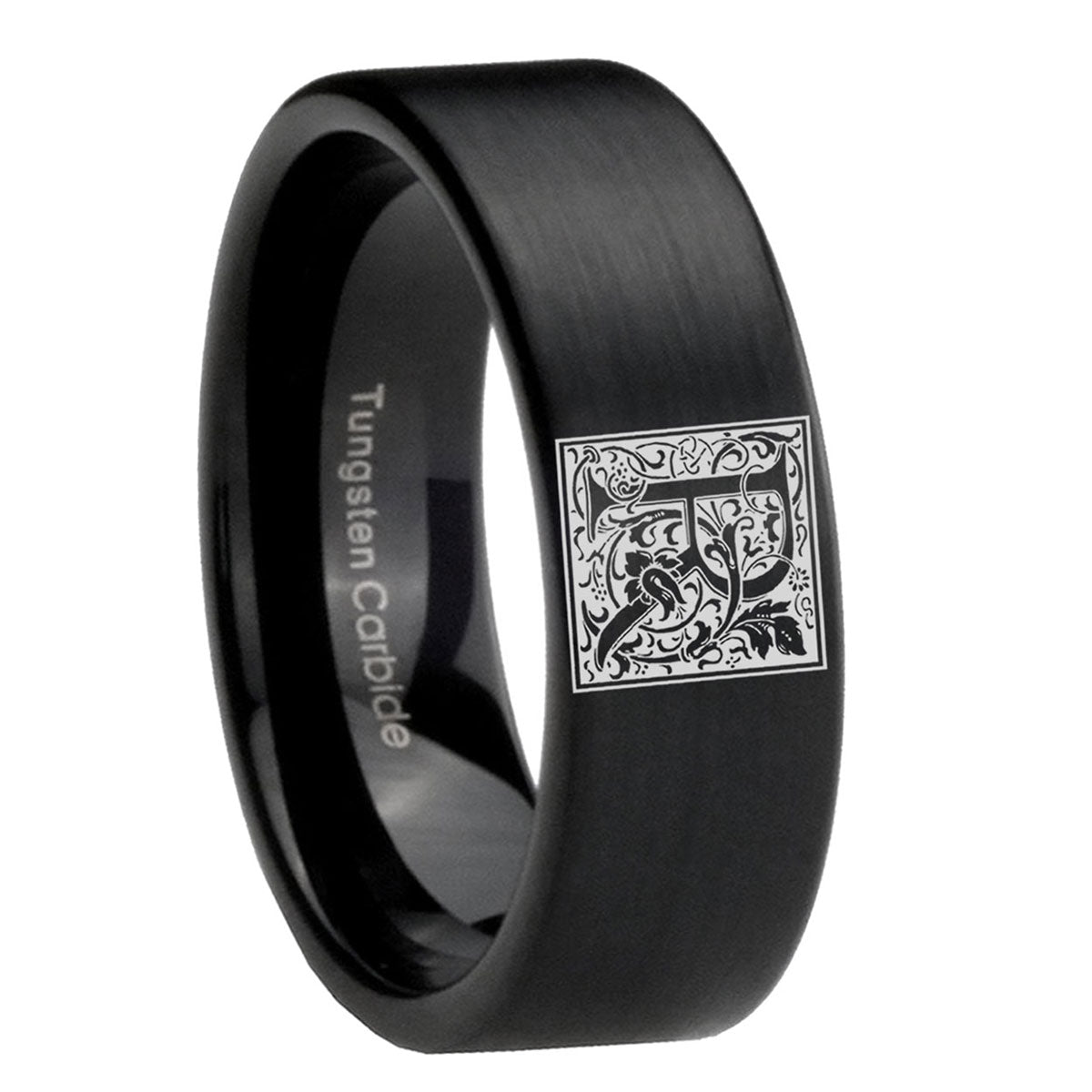 8mm Pipe Cut Matte Black Tungsten Floral Initial Letter R, Monogram Wedding Band