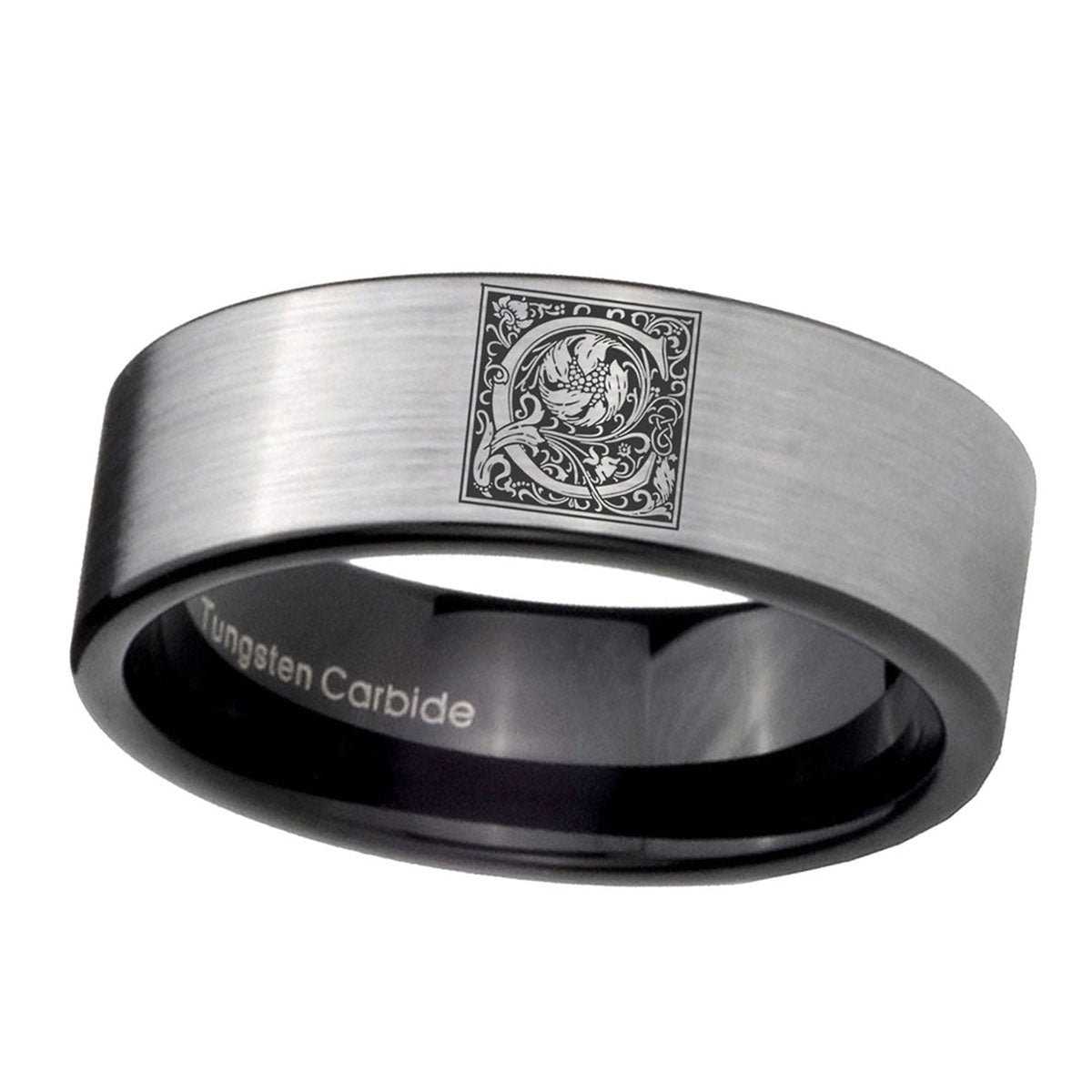 8mm Pipe Cut Gray Tungsten Floral Initial Letter C, Monogram Wedding Ring