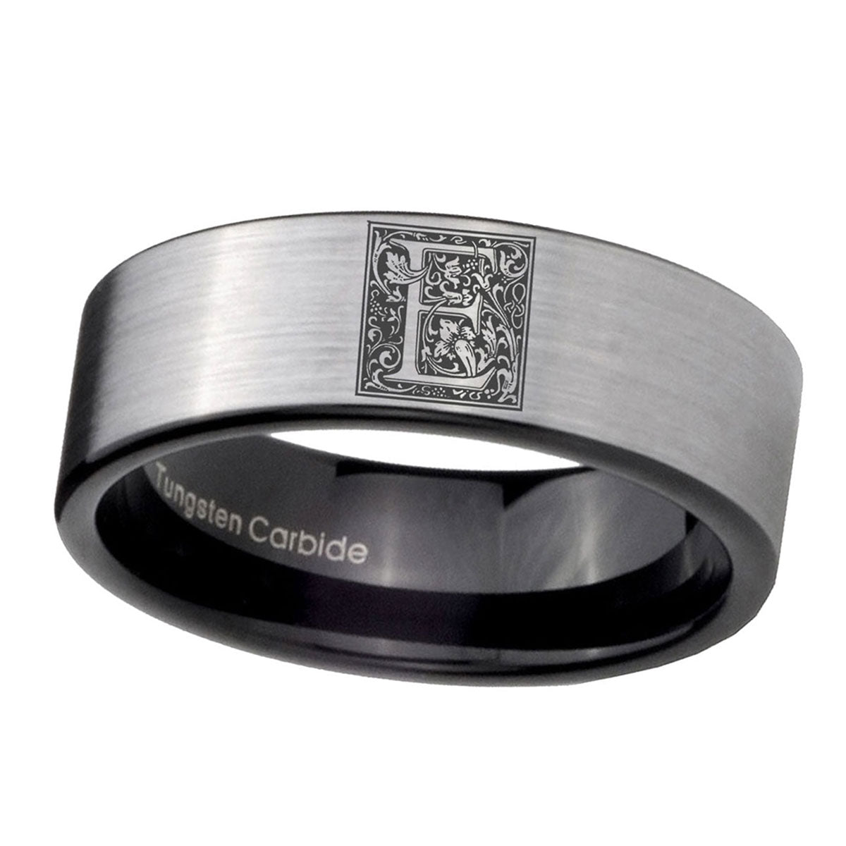 8mm Pipe Cut Gray Tungsten Floral Initial Letter E, Monogram Wedding Ring