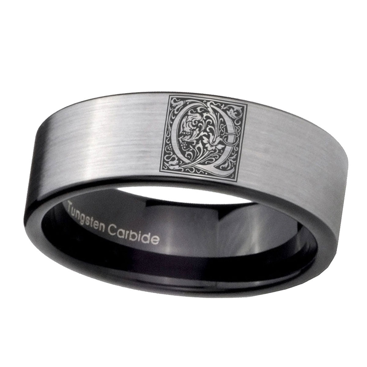 8mm Pipe Cut Gray Tungsten Floral Initial Letter Q, Monogram Wedding Ring