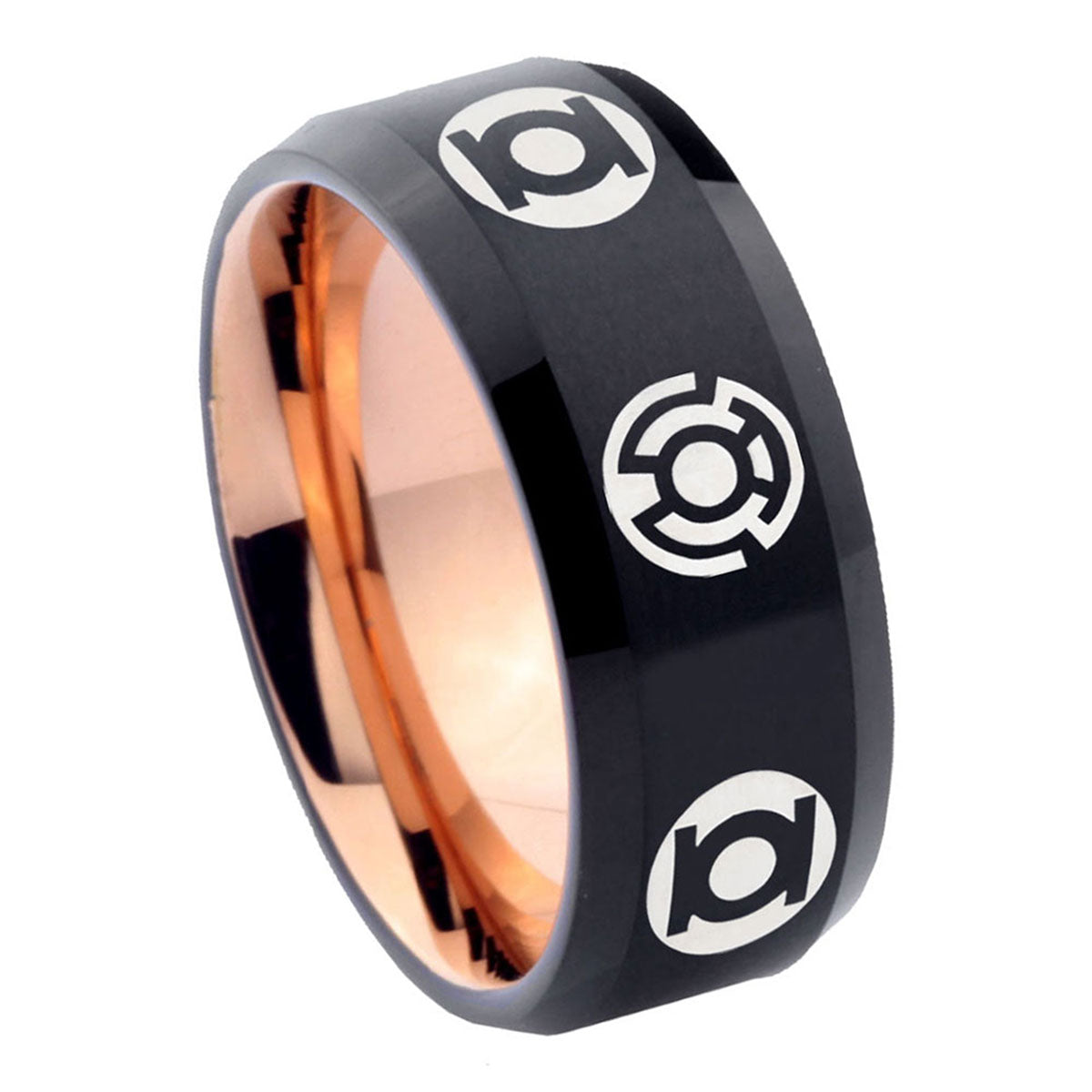 Introuding 5, 8mm Blue Green Lantern Beveled Edge Rose Gold Black Casual Rings . Offer in both 5mm and 8mm band width black and rose gold plated finished from size 4 to 14