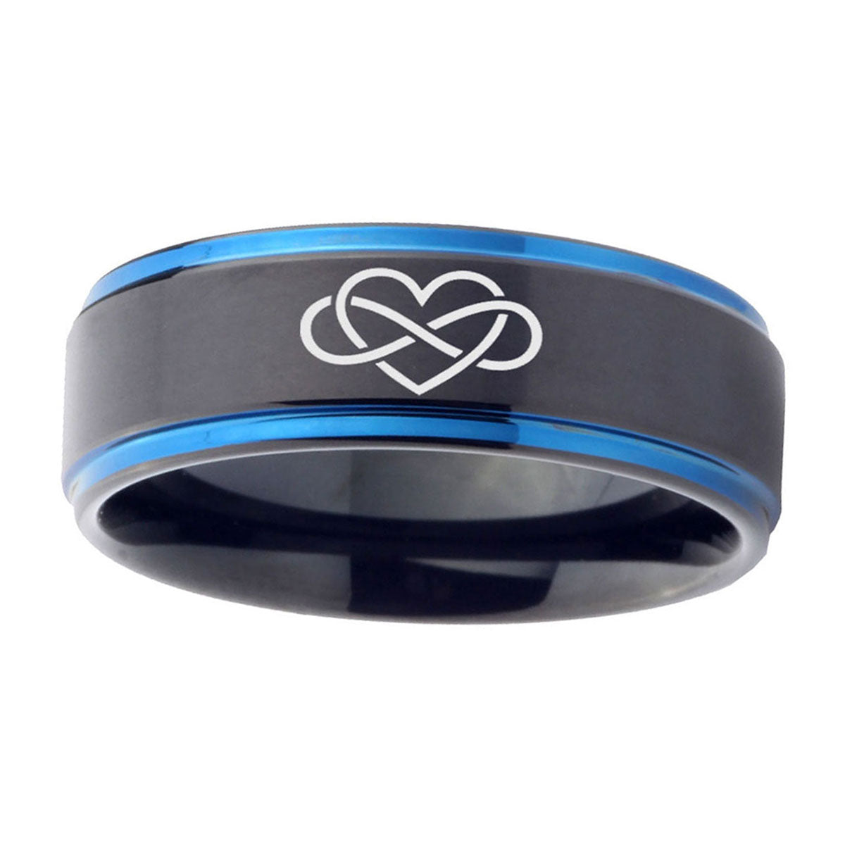 Introuding 5, 8mm Infinity Love Step Edge Black Blue Tungsten Mens Ring . Offer in both 5mm and 8mm band width black and blue plated finished from size 4 to 14