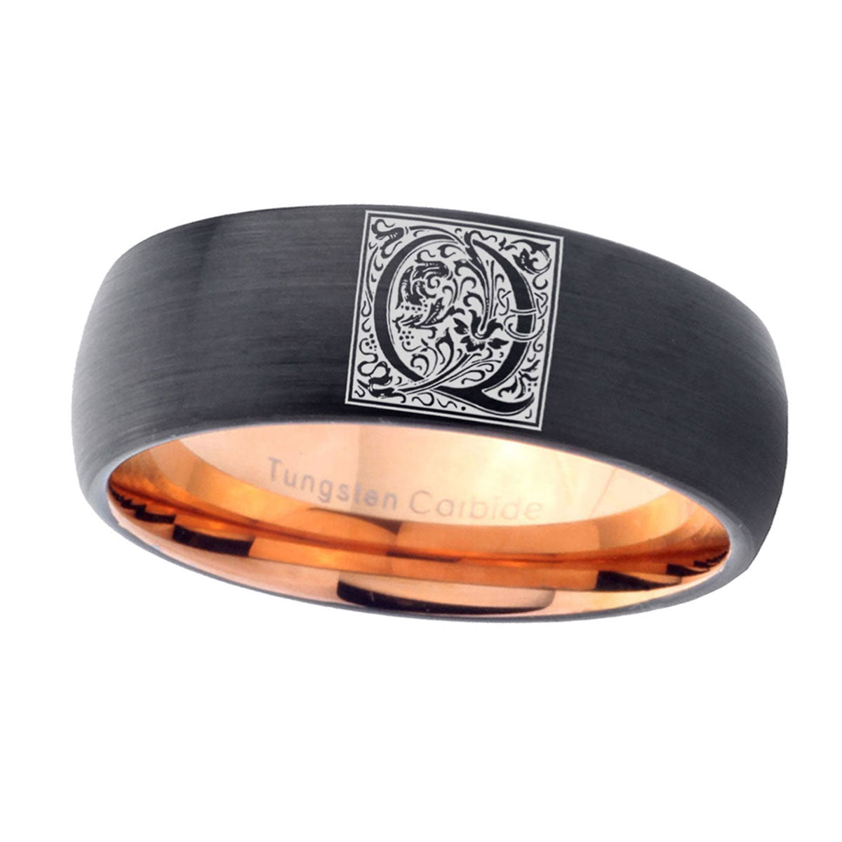 8mm Dome Black and Rose Gold Tungsten Floral Initial Letter Q, Monogram Wedding Band