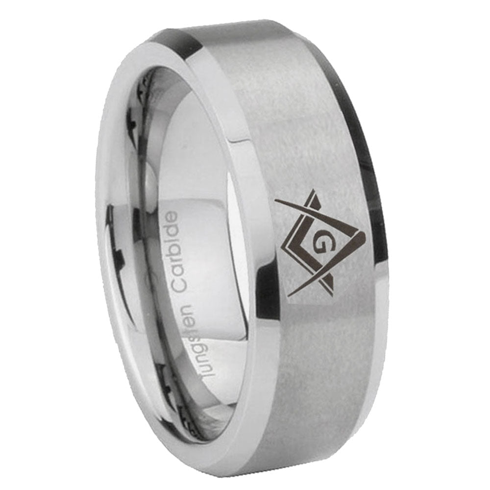 Celebrate with the 10mm Freemason Masonic Beveled Edges Matte Grey Tungsten CarbideWedding Band Mens. This silver tungsten ring with Masonic design is perfect for weddings.
