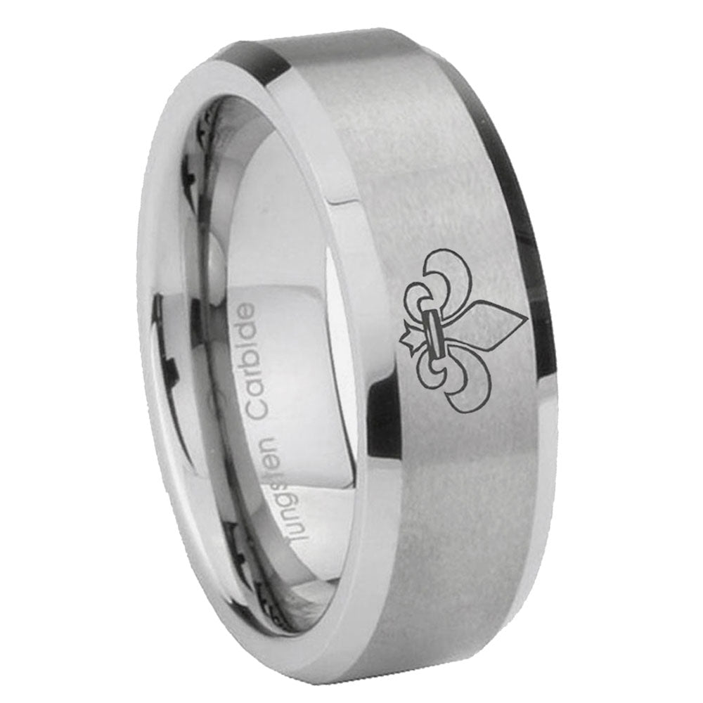 Personalize the 10mm Fleur De Lis Beveled Edges Matte Grey Tungsten CarbideMens Ring Engraved. This silver tungsten ring with Fleur De Lis design is perfect for custom engravings.