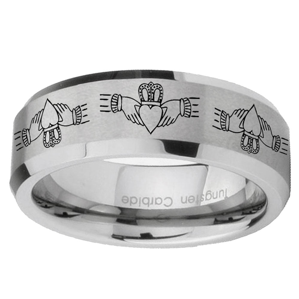 Style the 10mm Irish Claddagh Beveled Edges Matte Grey Tungsten CarbideMens Ring. This silver tungsten ring with Irish Claddagh design is perfect for men.