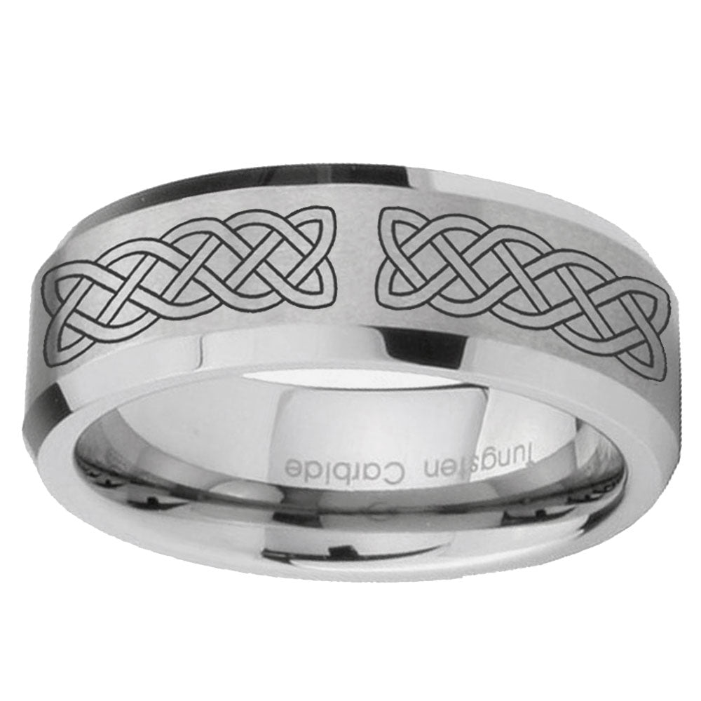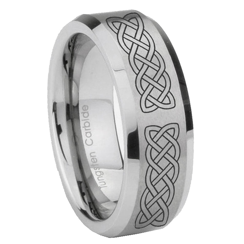 Style the 10mm Celtic Knot Beveled Edges Matte Grey Tungsten CarbideMen's Ring. This silver tungsten ring with Celtic knot design is perfect for men.