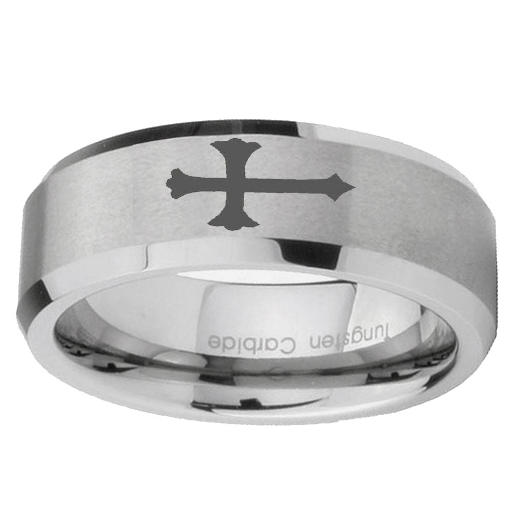 10mm Christian Cross Beveled Edges Matte Grey Tungsten Carbide Custom Mens Ring