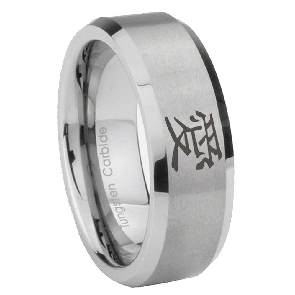 Style the 10mm Kanji Love Beveled Edges Matte Grey Tungsten CarbideMen's Bands Ring. This silver tungsten ring with Kanji Love design is perfect for men.