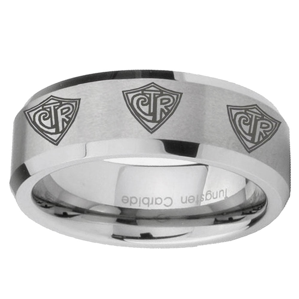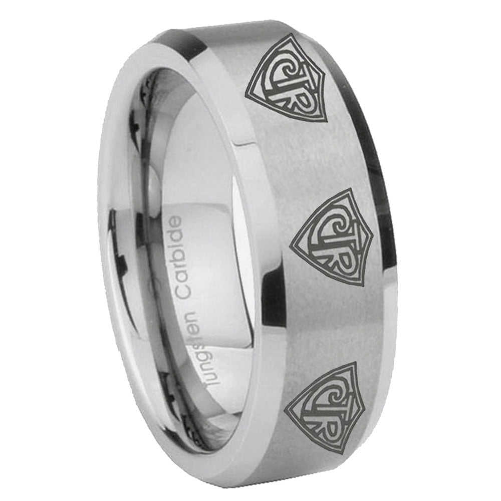 Personalize the 10mm Multiple CTR Beveled Edges Matte Grey Tungsten CarbideMens Ring Personalized. This silver tungsten ring with Multiple CTR design is perfect for custom engravings.