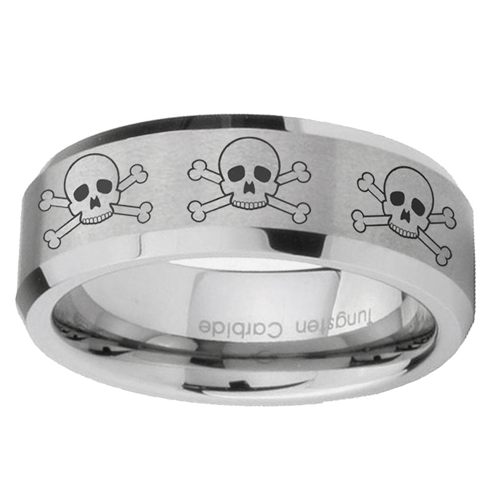 Personalize the 10mm Multiple Skull Beveled Edges Matte Grey Tungsten CarbideMens Ring Personalized. This silver tungsten ring with Multiple Skull design is perfect for personalization.