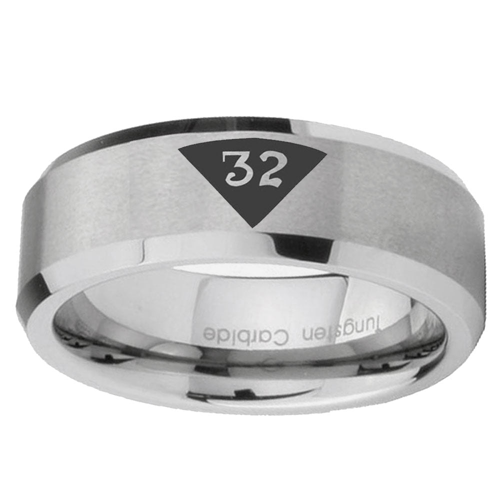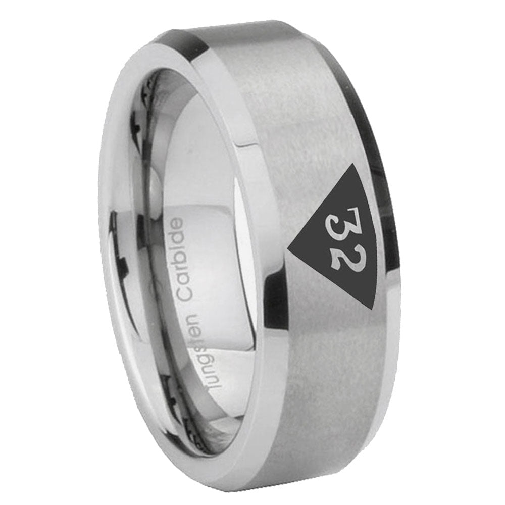 Style the 10mm Masonic 32 Triangle Design Freemason Beveled Edges Matte Grey Tungsten CarbideRings for Men. This silver tungsten ring with Masonic 32 Triangle Design Freemason design is perfect for men.