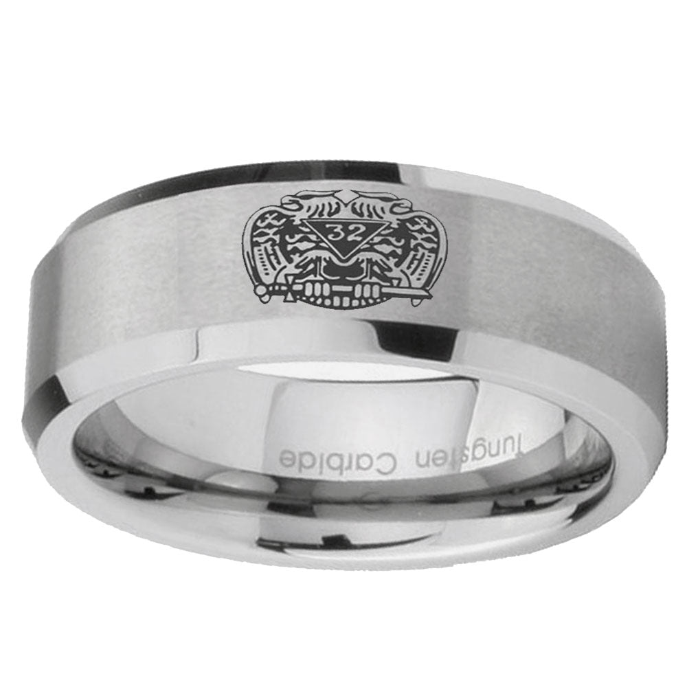 Style the 10mm Masonic 32 Degree Freemason Beveled Edges Matte Grey Tungsten CarbideRings for Men. This silver tungsten ring with Masonic 32 Degree Freemason design is perfect for men.