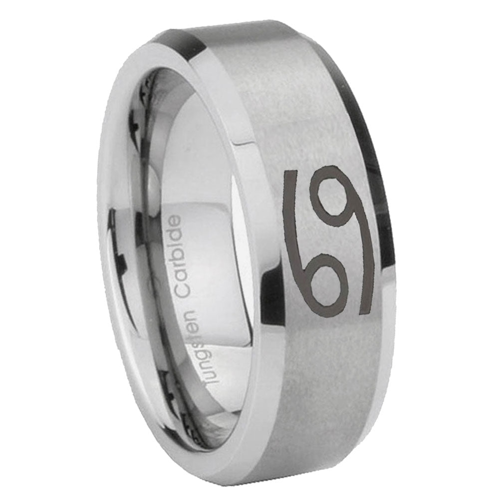 Propose with the 10mm Cancer Horoscope Beveled Edges Silver Tungsten Men's Engagement Band. This silver tungsten ring with Cancer design is perfect for engagements.