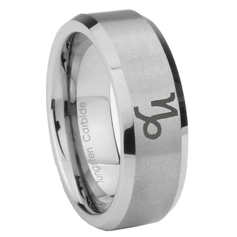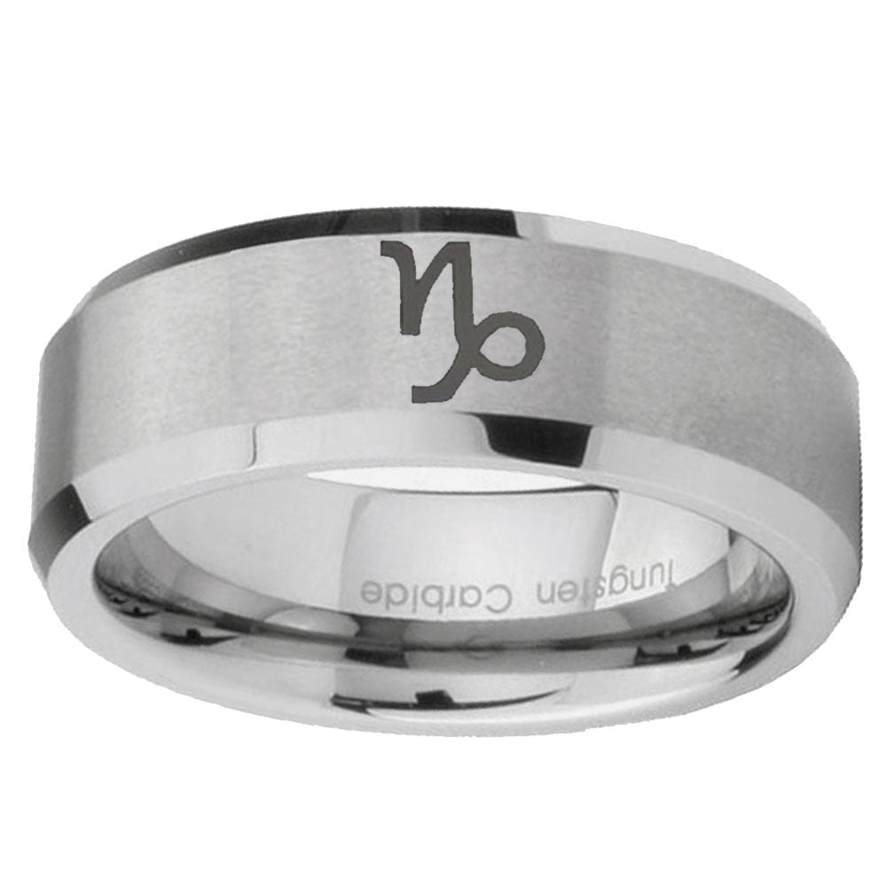 Propose with the 10mm Capricorn Zodiac Beveled Edges Silver Tungsten Mens Engagement Ring. This silver tungsten ring with Capricorn design is perfect for engagements.