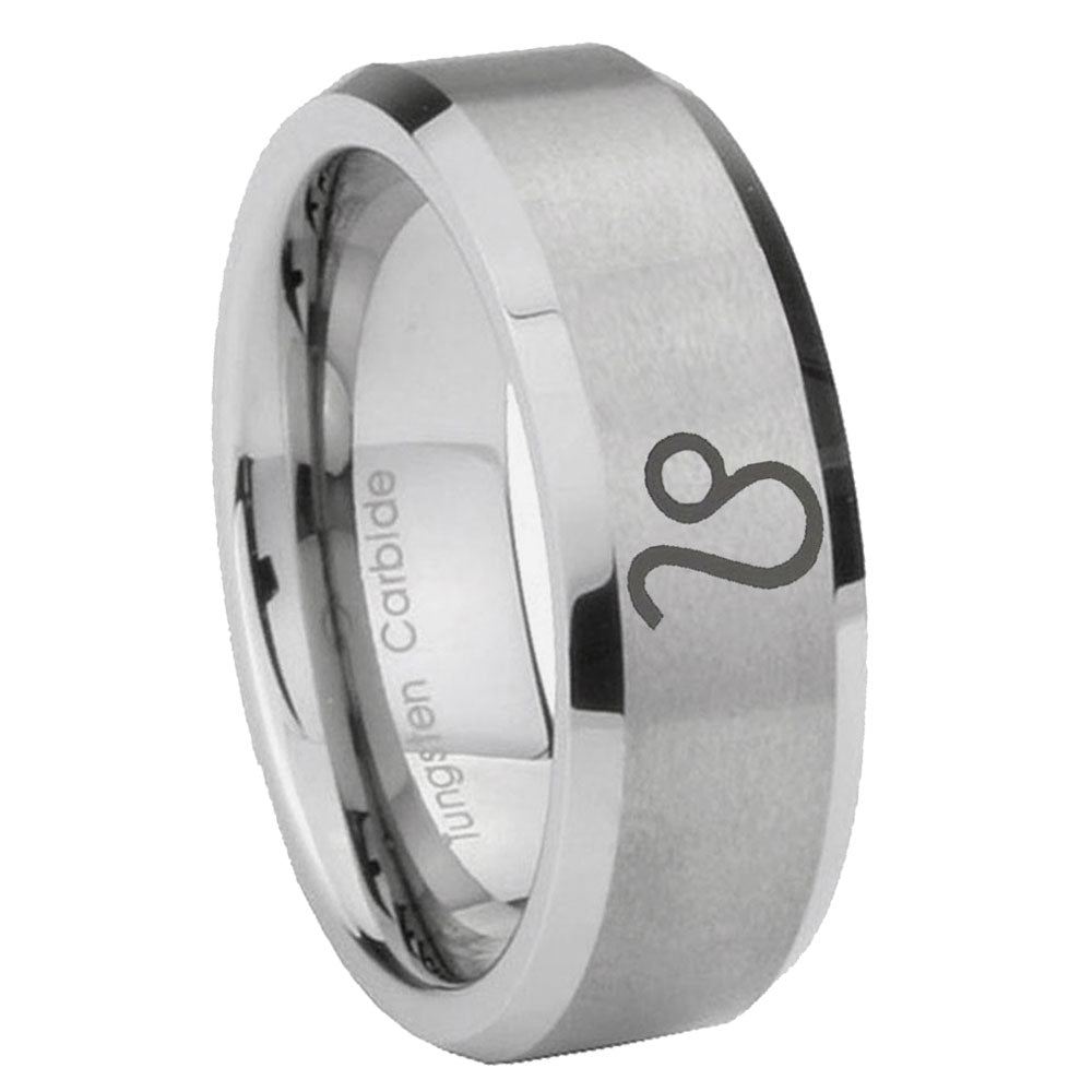 Make a promise with the 10mm Leo Zodiac Beveled Edges Matte Grey Tungsten CarbideMens Promise Ring. This silver tungsten ring with Leo Zodiac design is ideal for commitments.