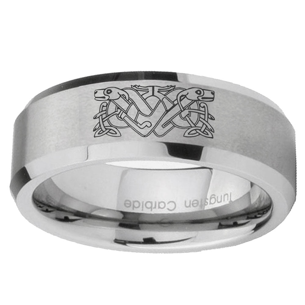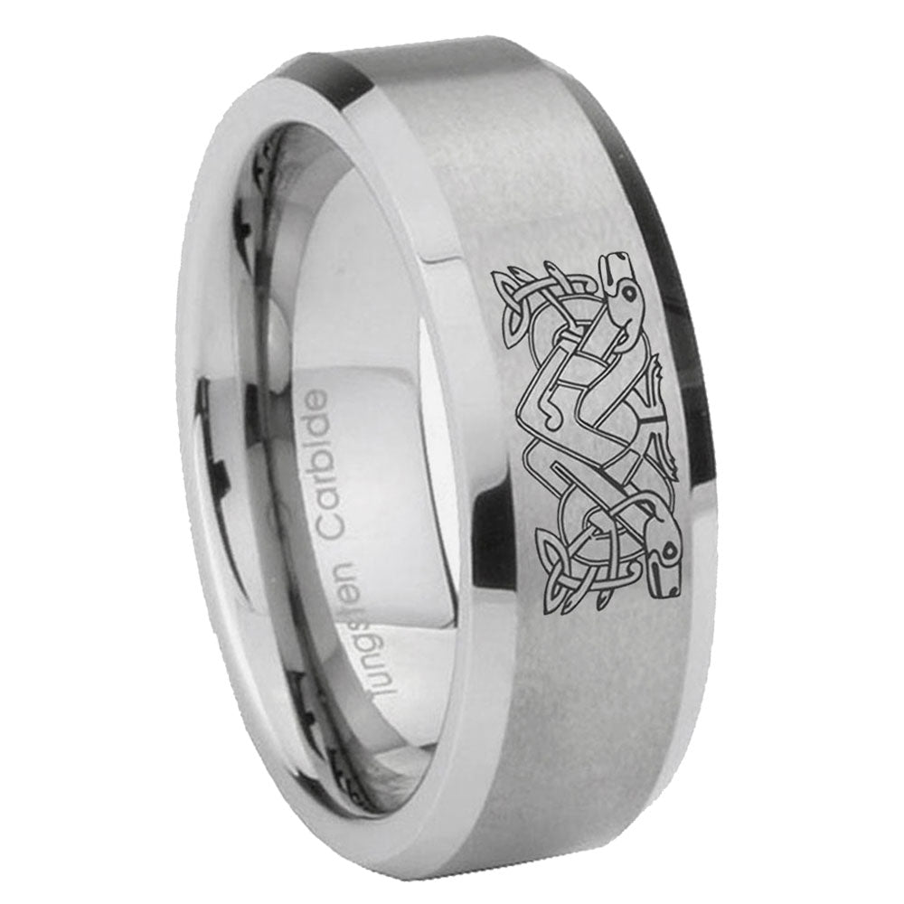 10mm Celtic Dog Beveled Edges Matte Grey Tungsten Carbide Mens Ring Engraved