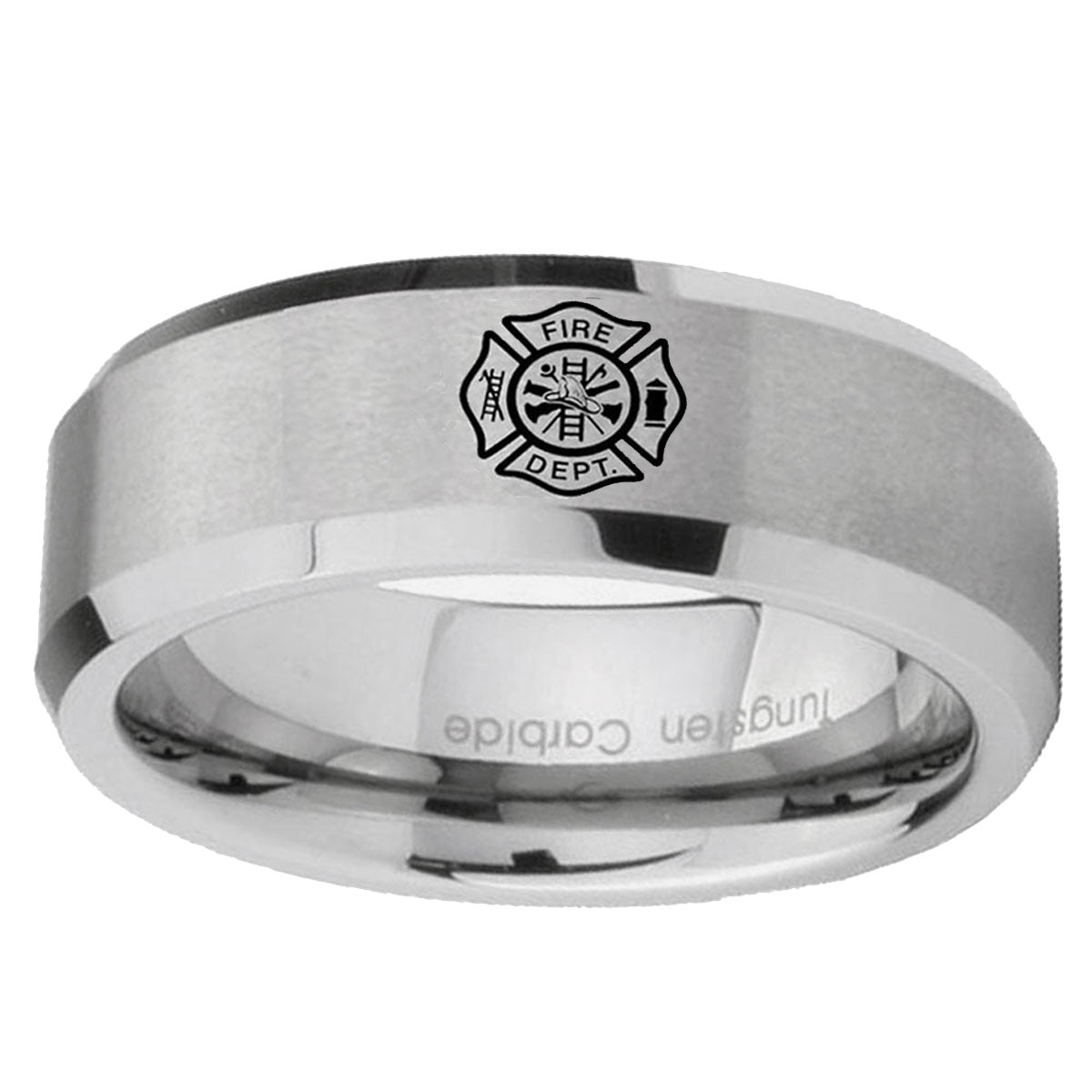 Customize the 10mm Fire Department Beveled Edges Matte Grey Tungsten CarbideCustom Ring for Men. This silver tungsten ring with Fire Department design is perfect for personalization.