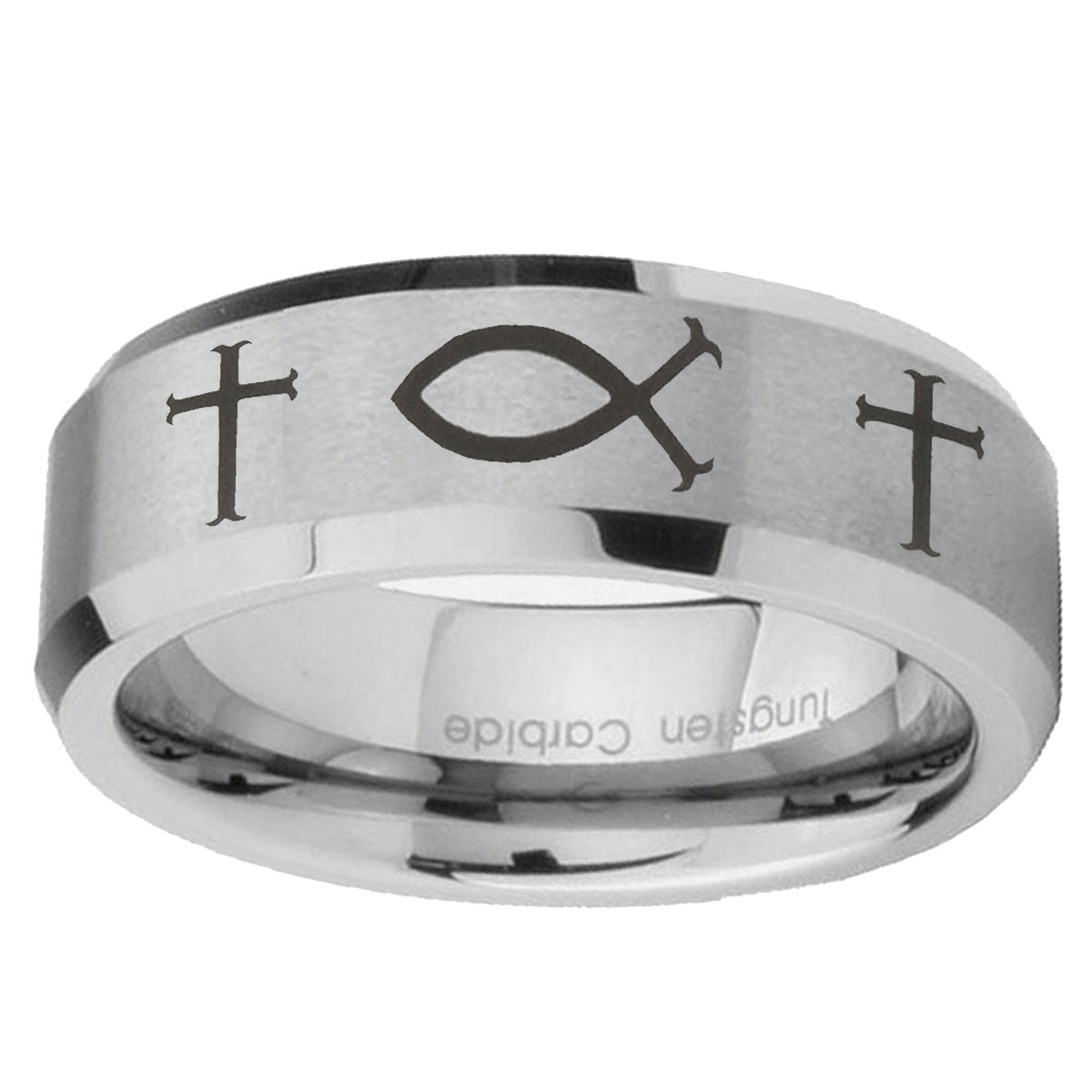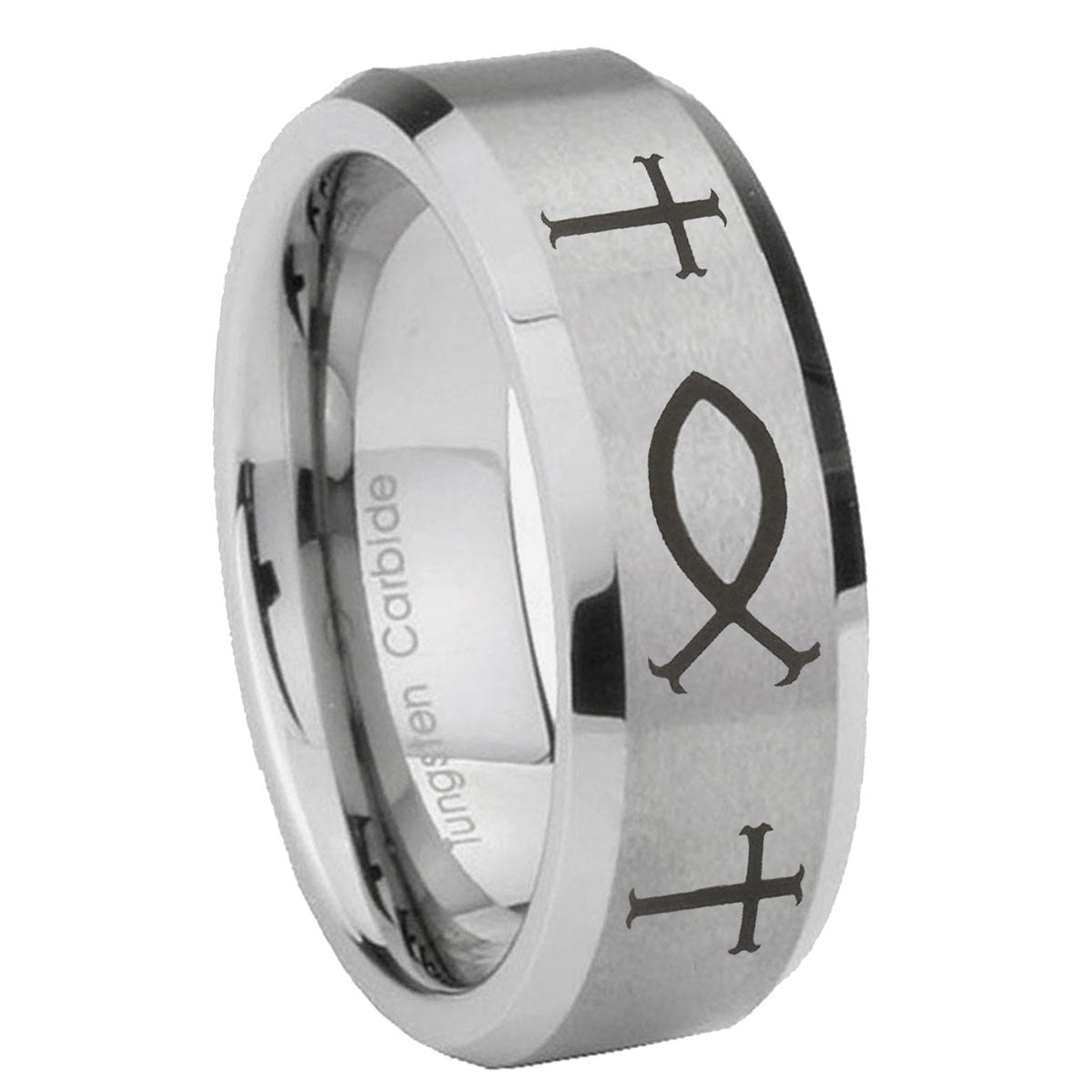 Propose with the 10mm Fish & Cross Beveled Edges Matte Grey Tungsten CarbideMens Engagement Band. This silver tungsten ring with Fish & Cross design is ideal for engagements.