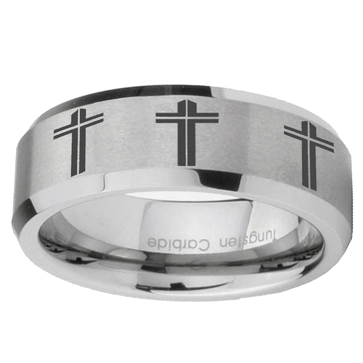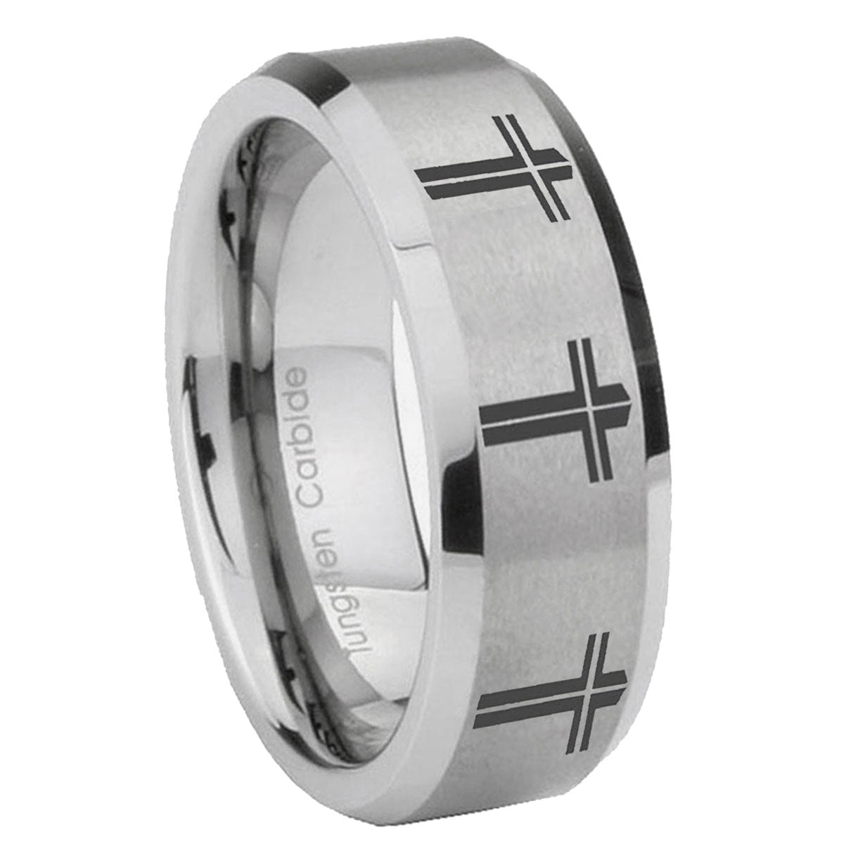 10mm Multiple Christian Cross Beveled Edges Matte Grey Tungsten Engagement Ring