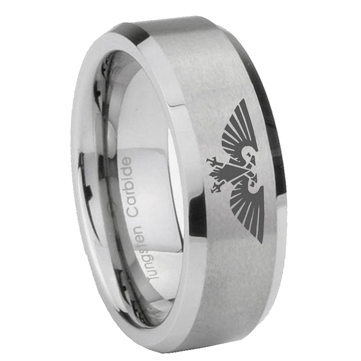 Personalize the 10mm Aquila Beveled Edges Matte Grey Tungsten CarbidePersonalized Ring. This silver tungsten ring with Aquila design is perfect for custom jewelry.