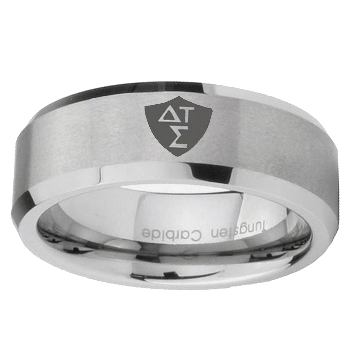 Celebrate milestones with the 10mm Greek CTR Beveled Edges Matte Grey Tungsten CarbideMens Anniversary Ring. This silver tungsten ring with Greek CTR design is perfect for anniversaries.