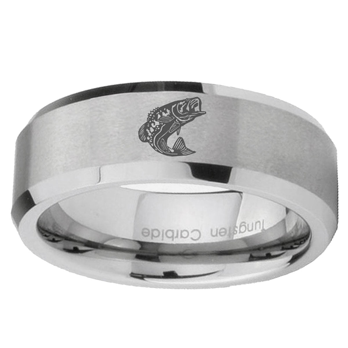 Personalize the 10mm Fishing Beveled Edges Matte Grey Tungsten CarbideMens Ring Engraved. This silver tungsten ring with Fishing design is perfect for custom engravings.