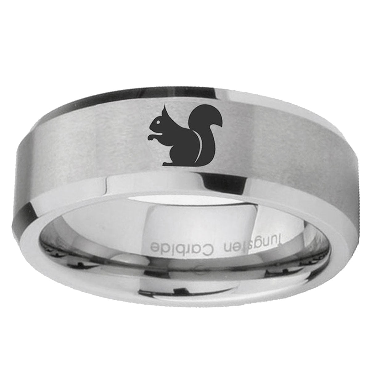 Personalize the 10mm Squirrel Beveled Edges Matte Grey Tungsten CarbideMens Ring Engraved. This silver tungsten ring with Squirrel design is perfect for custom engravings.