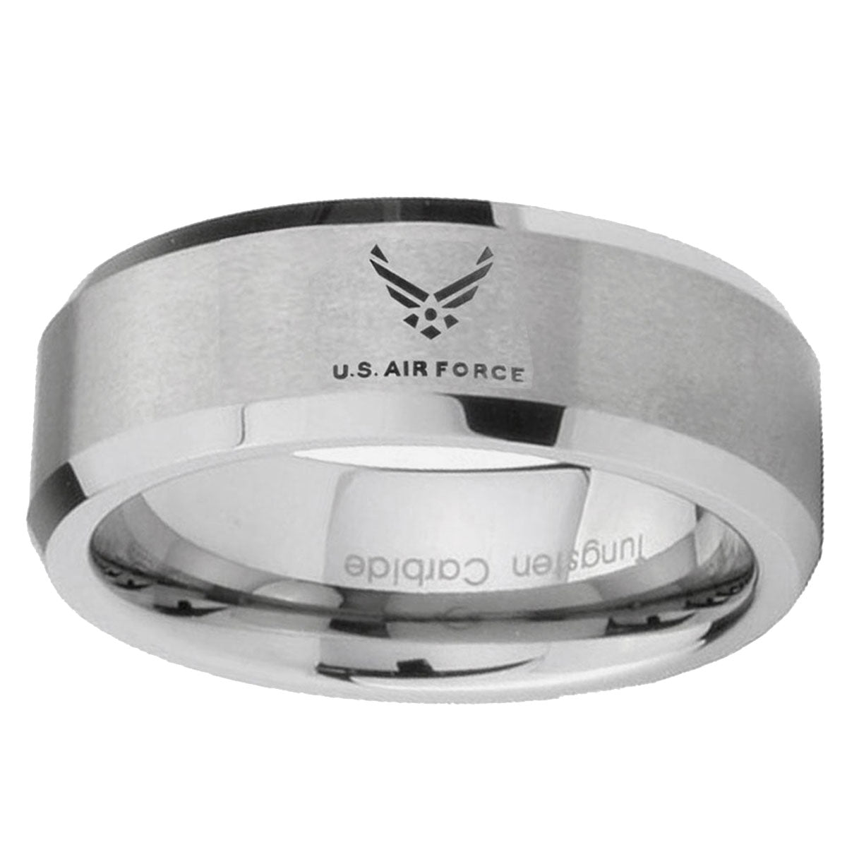 Honor service with the 10mm Beveled US Air Force Mirror Beveled Edges Matte Grey Tungsten CarbideRing. This silver tungsten ring with US Air Force design is perfect for veterans or enthusiasts.