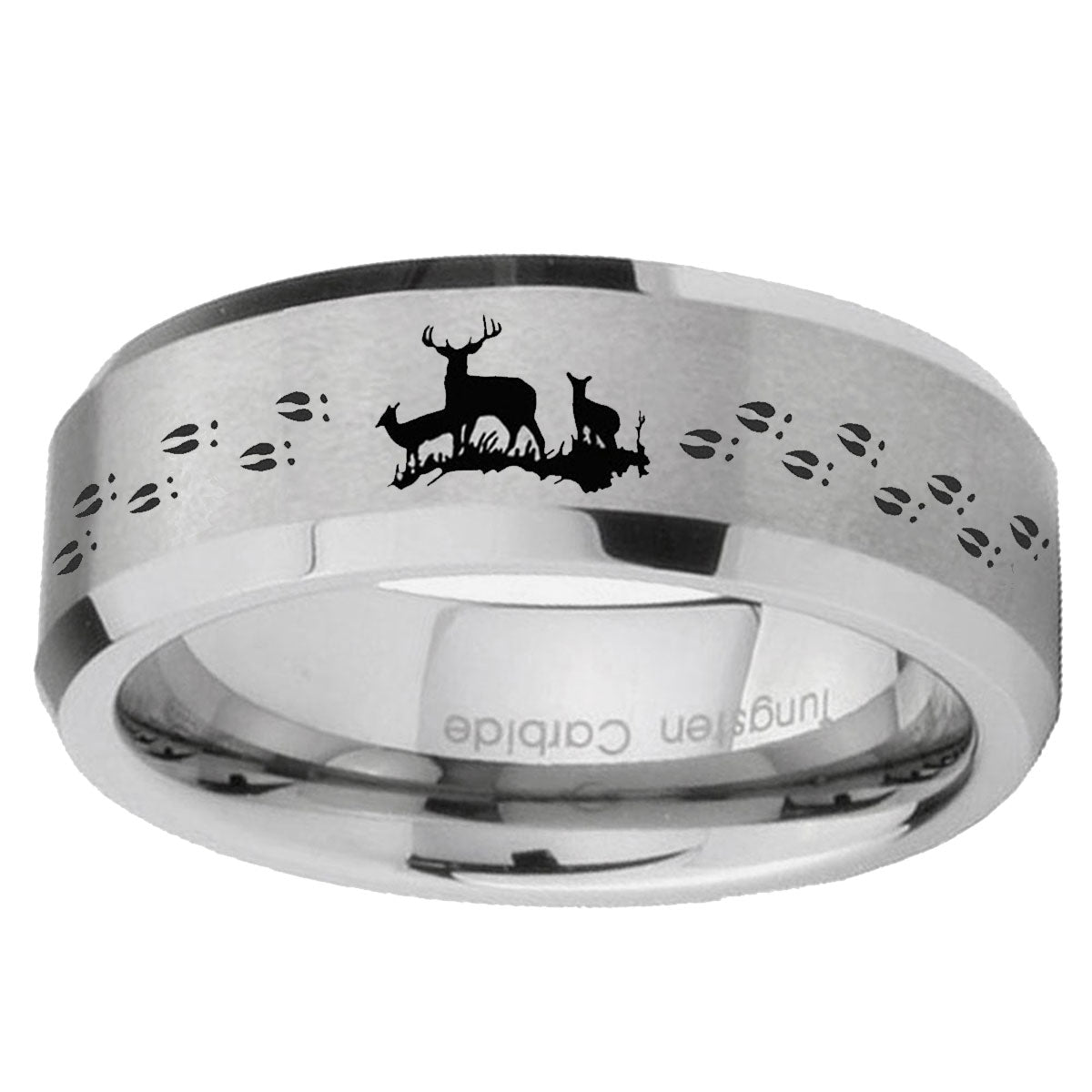 Personalize the 10mm Deer Hunting Beveled Edges Matte Grey Tungsten CarbideMens Ring Engraved. This silver tungsten ring with Deer Hunting design is perfect for custom engravings.