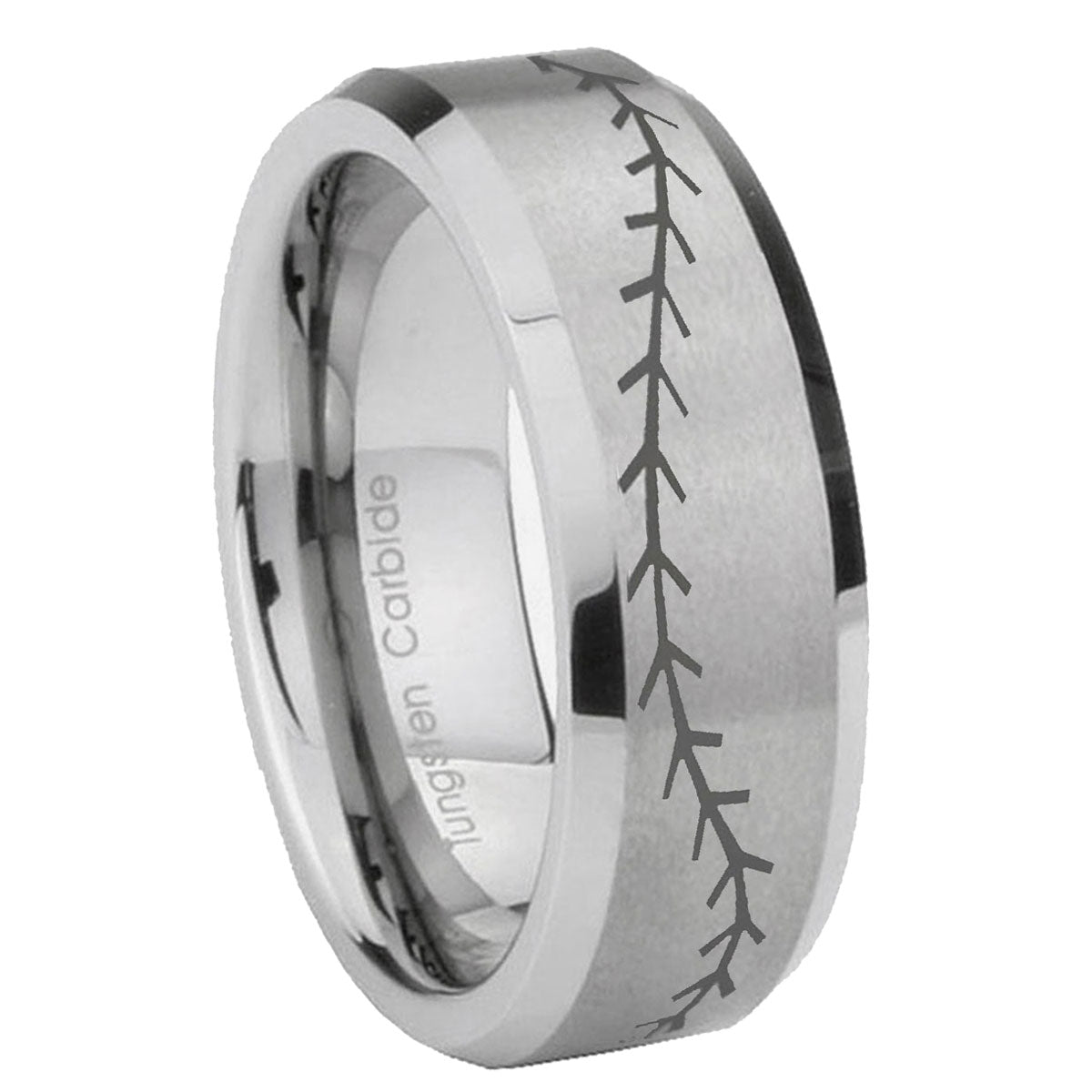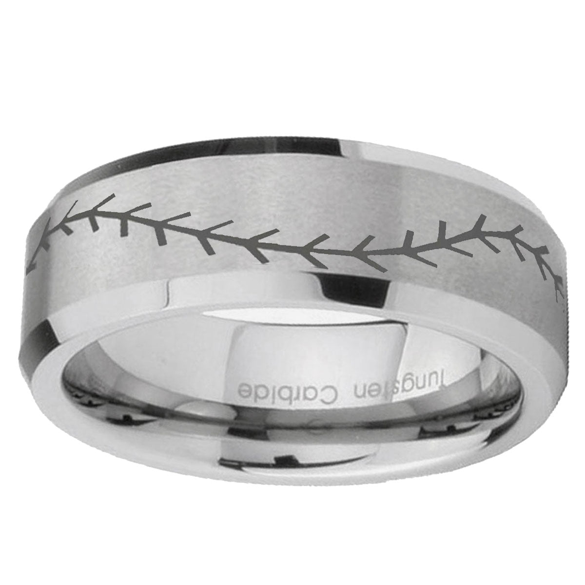 Celebrate with the 10mm Baseball Stitch Beveled Edges Matte Grey Tungsten CarbideWedding Band Ring. This silver tungsten ring with baseball stitch design is perfect for weddings.