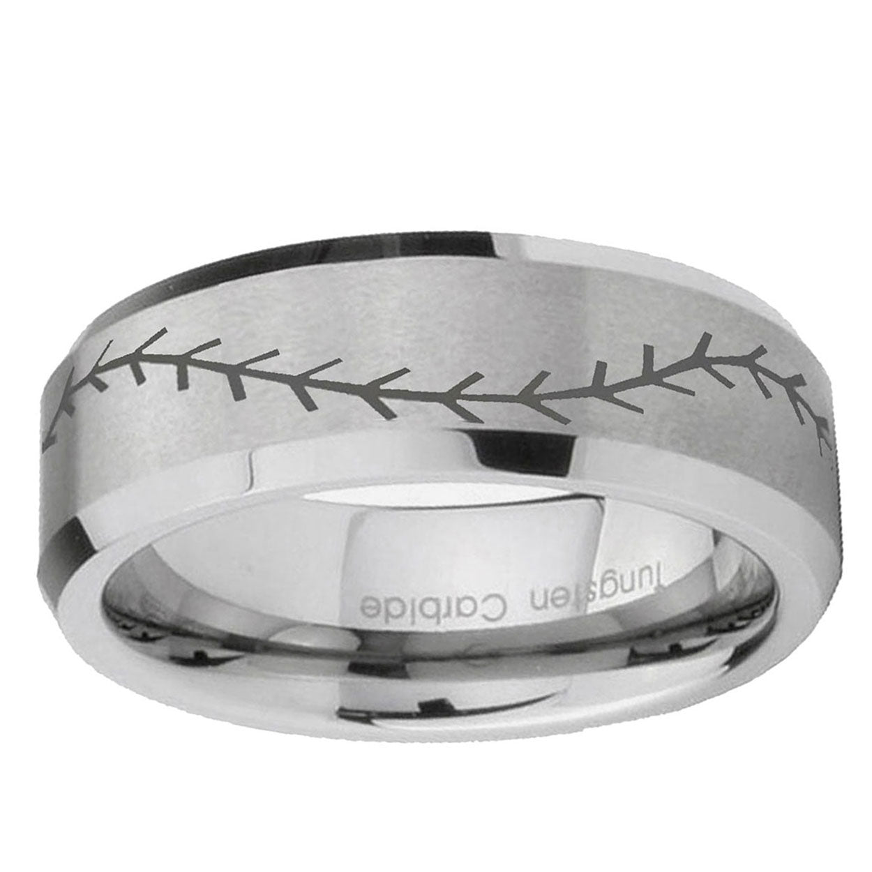 Celebrate with the 10mm Baseball Stitch Beveled Edges Matte Grey Tungsten Carbide Wedding Band Ring. This silver tungsten ring with baseball stitch design is perfect for weddings.