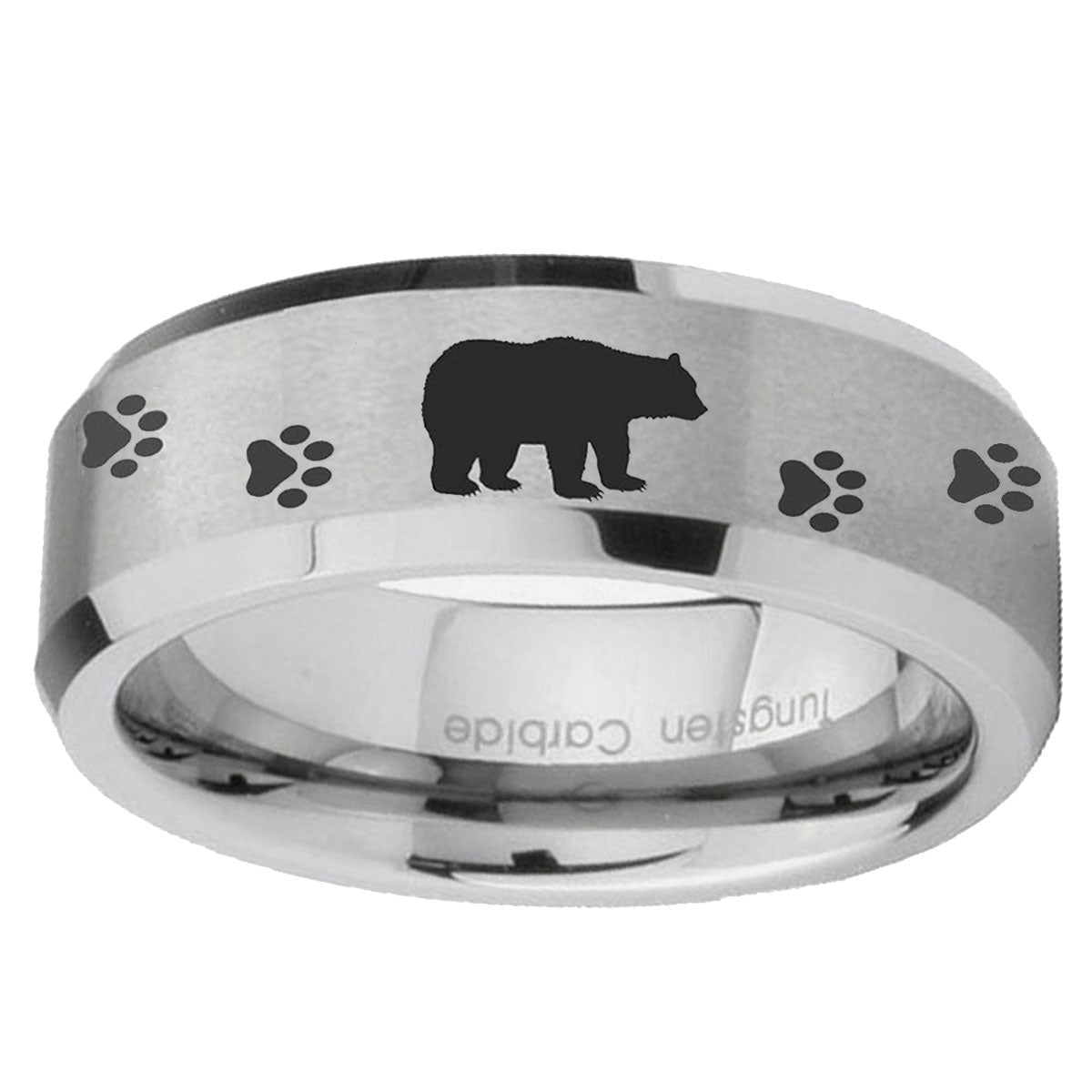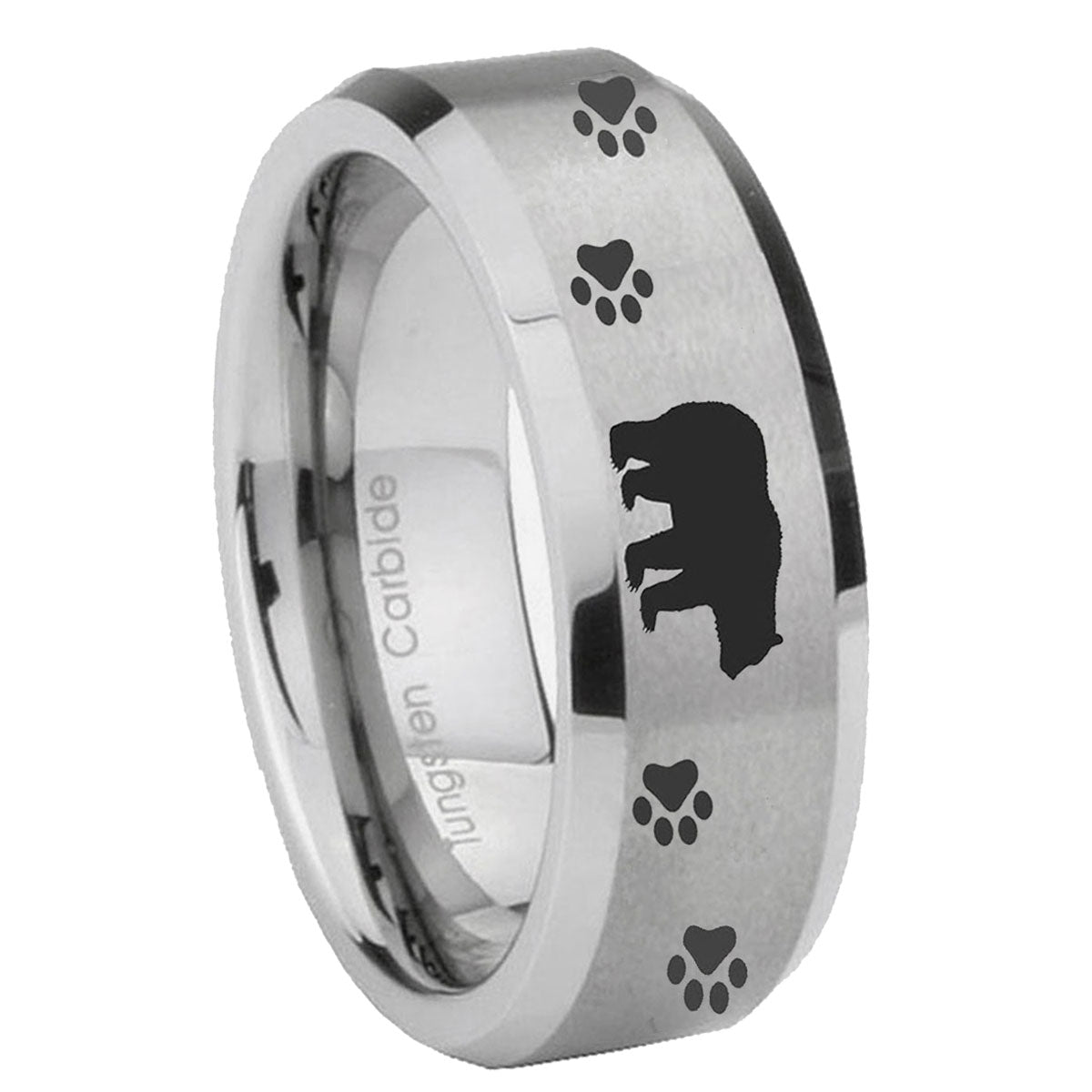 Personalize your style with the 10mm Bear and Paw Beveled Edges Matte Grey Tungsten CarbideEngraved Ring. This silver tungsten ring with bear and paw accents is perfect for custom engravings and lasting durability.