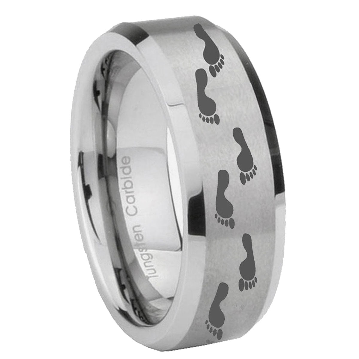 Celebrate milestones with the 10mm Foot Print Beveled Edges Matte Grey Tungsten CarbideMens Anniversary Ring. This silver tungsten ring with Foot Print design is perfect for anniversaries.