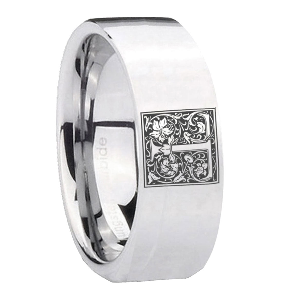 8mm Pipe Cut Polished Silver Tungsten Floral Initial Letter T, Monogram Wedding Bands