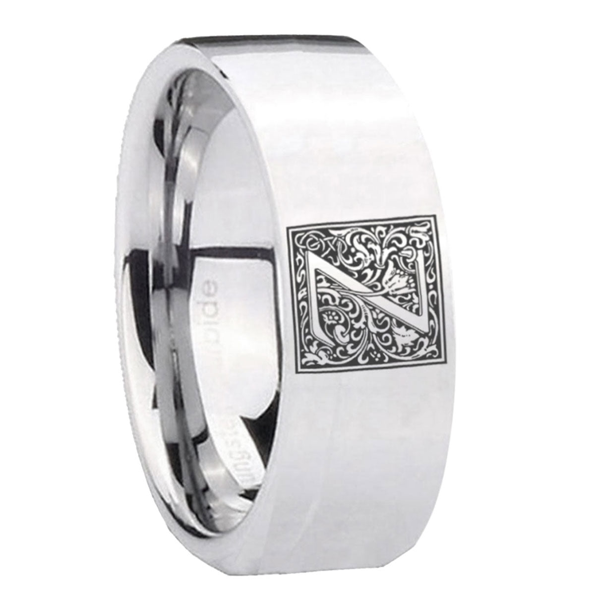 8mm Pipe Cut Polished Silver Tungsten Floral Initial Letter Z, Monogram Wedding Bands