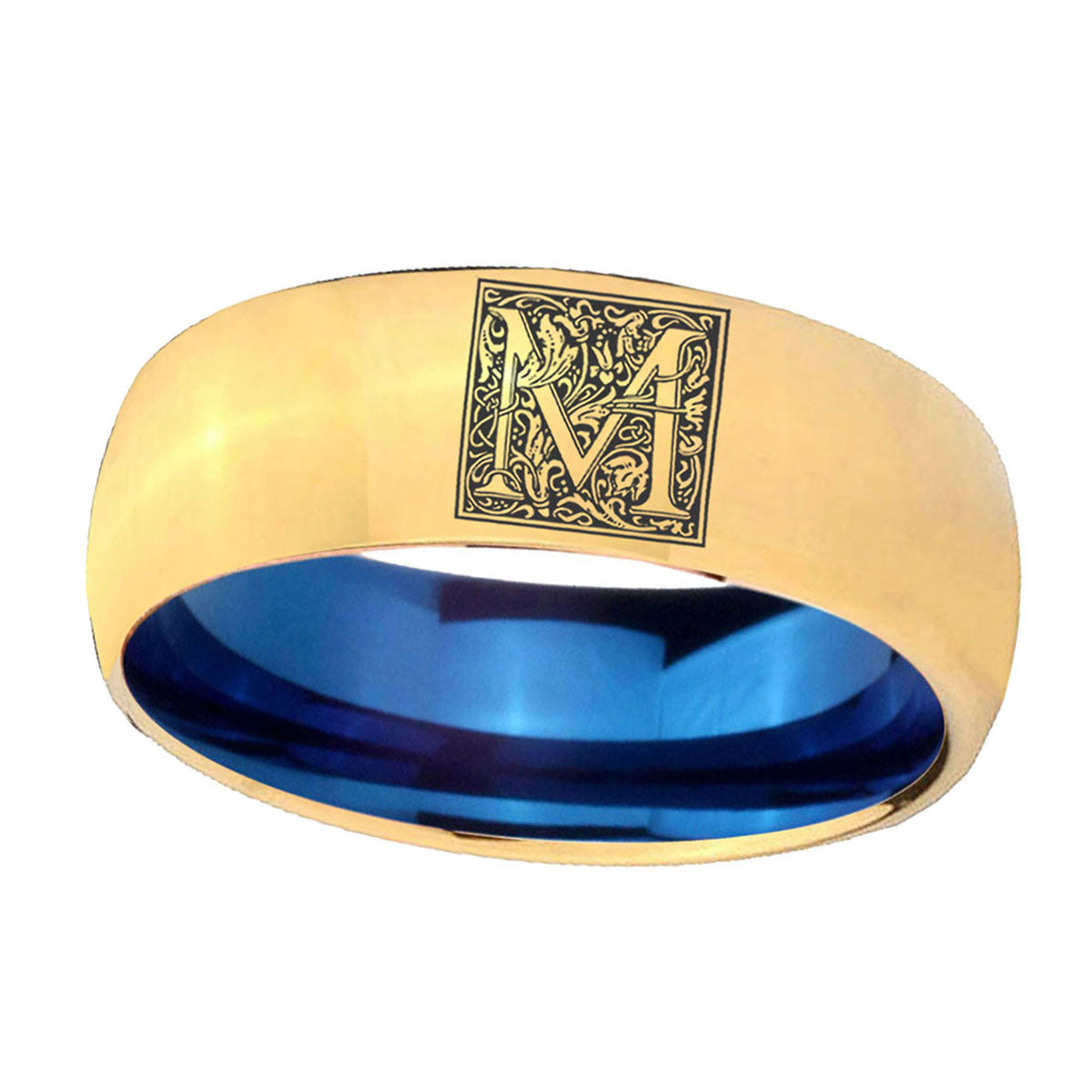 This classic dome tungsten carbide ring in gold and blue color with Monogram Floral Initial Letter M engraved on it.