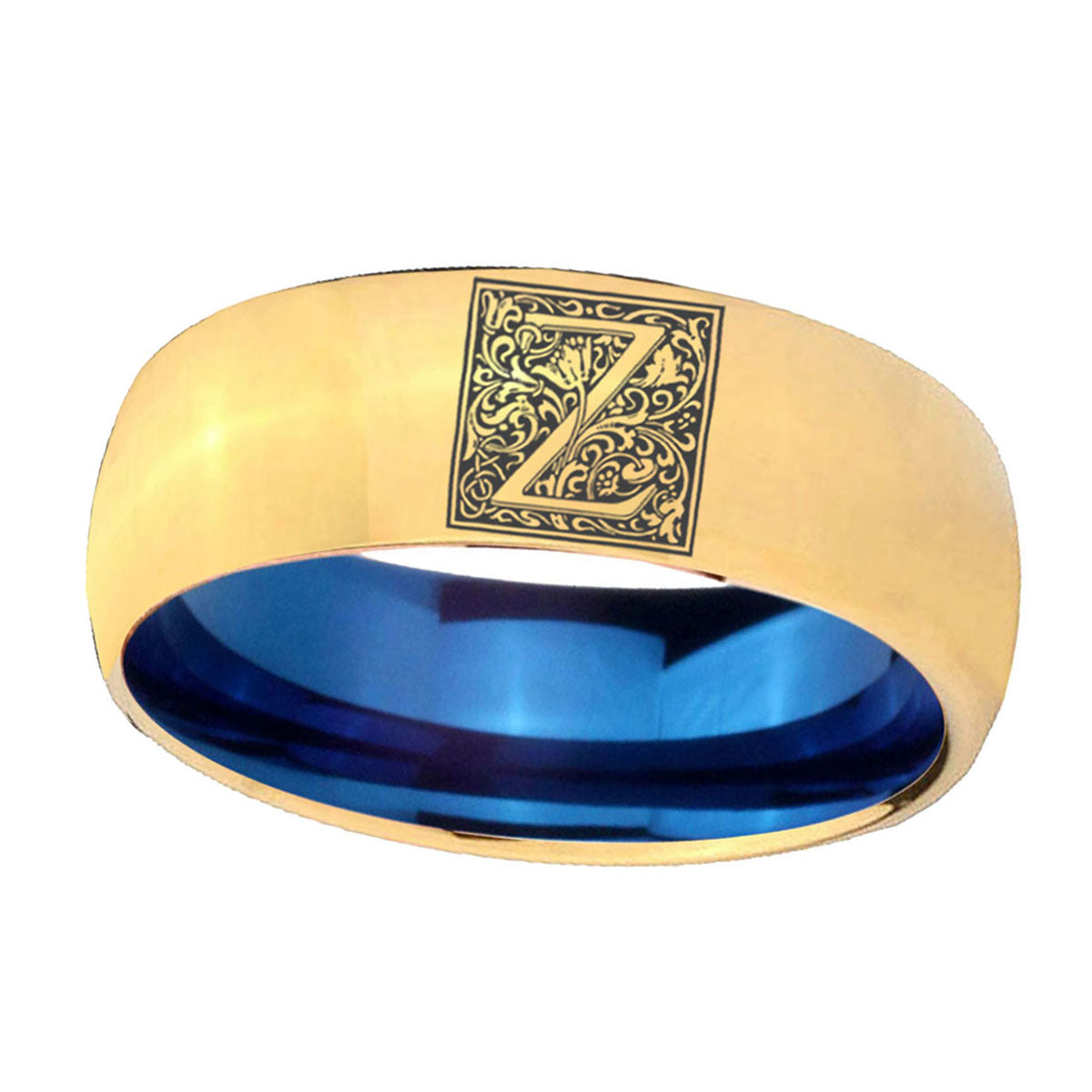 8mm Dome Gold and Blue Tungsten Floral Initial Letter Z, Monogram Engraved Ring