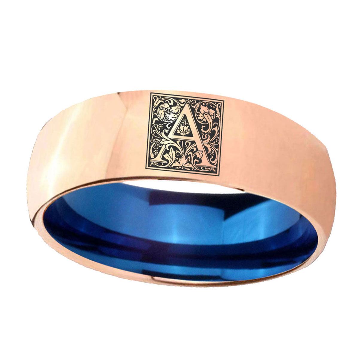 This classic dome tungsten carbide ring in rose gold and blue color with Monogram Floral Initial Letter A engraved on it.